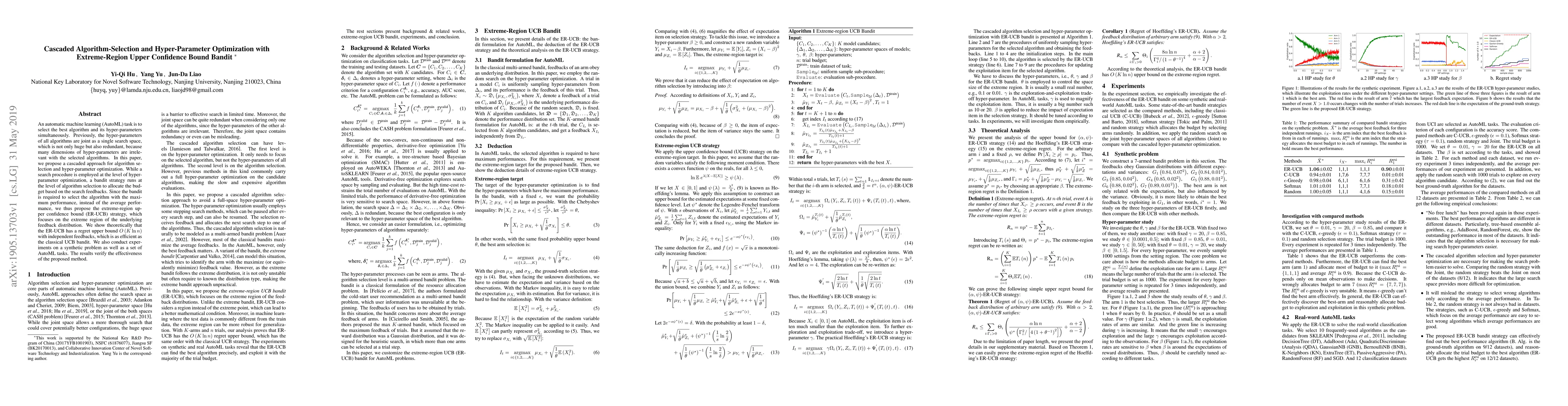 This paper proposes a cascaded algorithm-selection and hyper-parameter optimization method using an extreme-region upper confidence bound (ER-UCB) bandit strategy. The approach separates algorithm selection from hyper-parameter optimization to avoid redundant search spaces, achieving better performance and efficiency compared to traditional joint search methods.