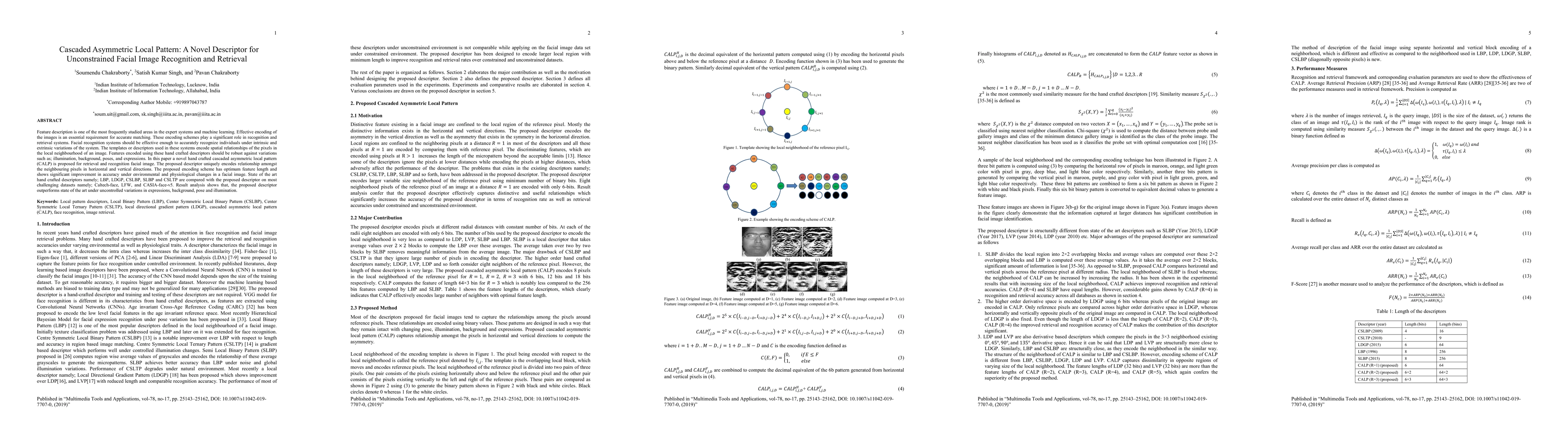 This paper introduces a novel cascaded asymmetric local pattern (CALP) descriptor for facial image recognition and retrieval, which encodes spatial relationships of pixels in local neighborhoods. The proposed method outperforms existing handcrafted descriptors like LBP and LDGP on challenging datasets under various environmental and physiological variations.