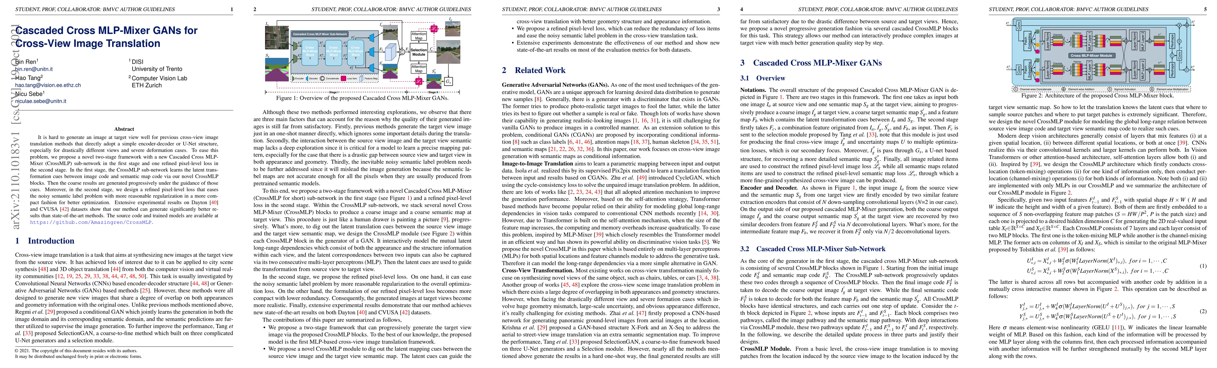 This paper proposes a two-stage Cascaded Cross MLP-Mixer GAN framework for cross-view image translation, utilizing a novel CrossMLP sub-network for latent transformation learning and a refined pixel-level loss for optimization, achieving superior results on Dayton and CVUSA datasets compared to state-of-the-art methods.