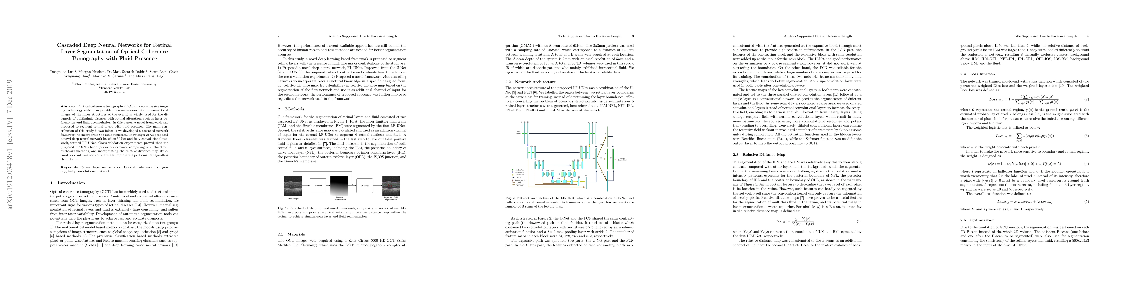 This paper proposes a novel cascaded deep neural network, LF-UNet, for segmenting retinal layers in OCT images with fluid presence. The framework incorporates structural prior knowledge and outperforms state-of-the-art methods, demonstrating improved performance through the use of relative distance maps.