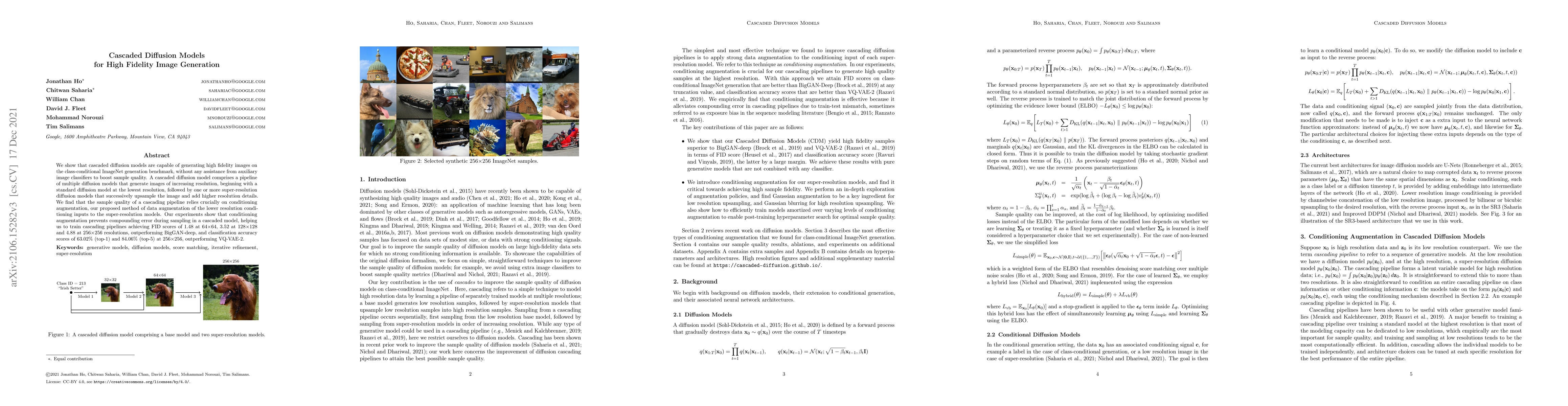 This paper proposes cascaded diffusion models for high fidelity image generation, achieving superior FID scores and classification accuracy compared to existing methods. The key to their success is conditioning augmentation, which prevents error compounding during the cascading process.
