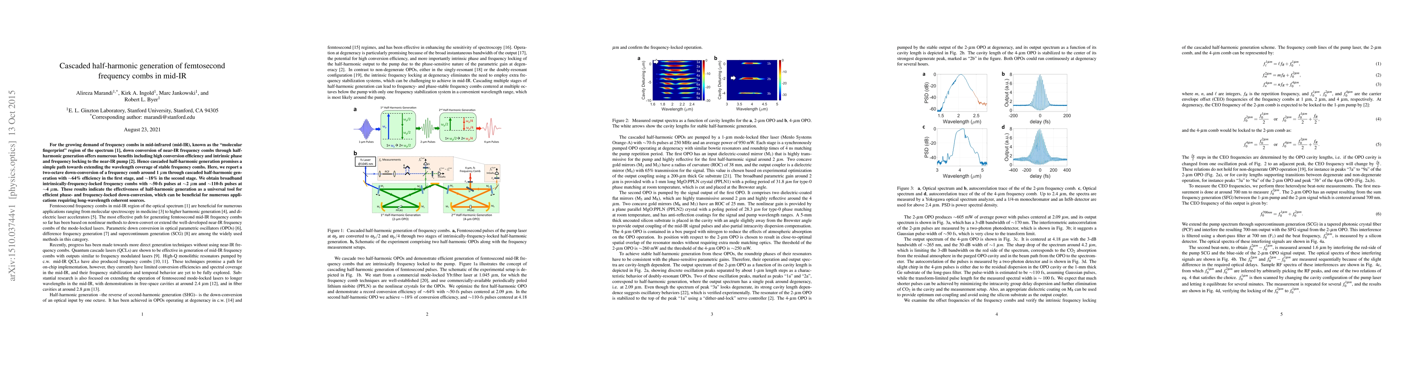 This paper reports a two-octave down-conversion of near-IR frequency combs through cascaded half-harmonic generation, achieving high efficiency and broadband, intrinsically-frequency-locked mid-IR combs with pulses as long as 110 fs. The technique promises a practical method for generating long-wavelength coherent sources.