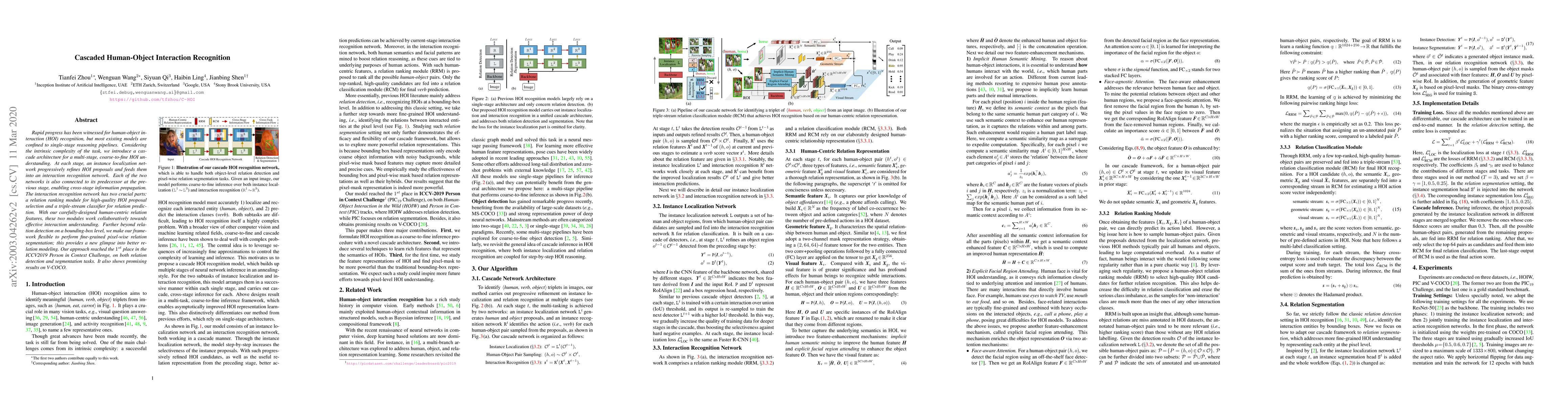 This paper proposes a cascaded architecture for human-object interaction recognition, featuring a multi-stage, coarse-to-fine reasoning process. The framework includes an instance localization network and an interaction recognition network, with cross-stage information propagation and a relation ranking module for proposal selection, achieving top results in the ICCV2019 Person in Context Challenge.