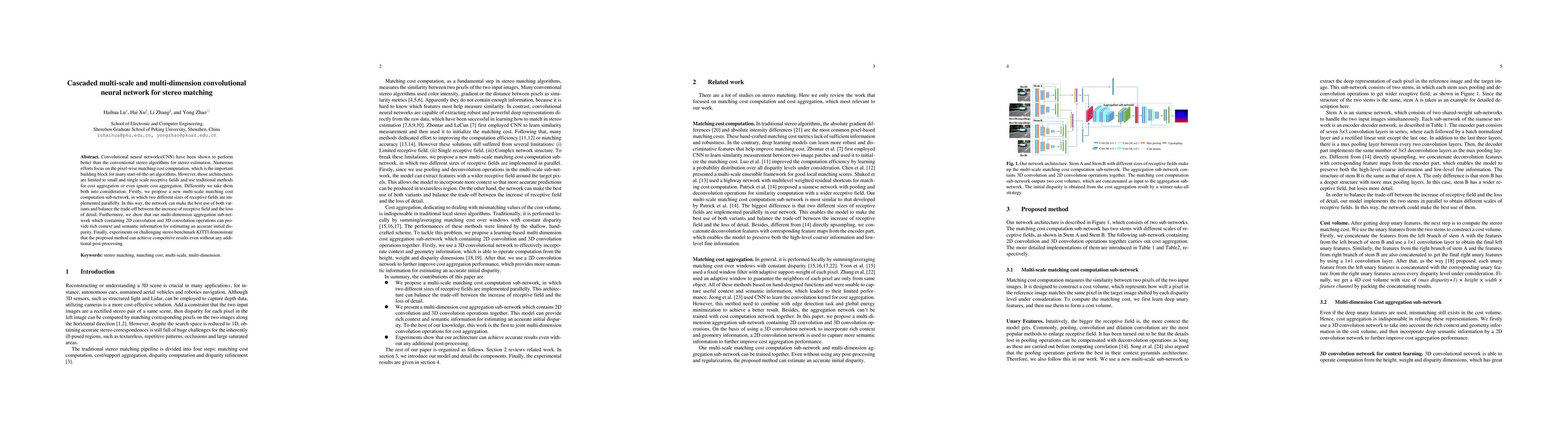This paper proposes a cascaded multi-scale and multi-dimension convolutional neural network for stereo matching, utilizing parallel multi-scale receptive fields and a combination of 2D and 3D convolutions for cost aggregation to achieve accurate disparity estimation, demonstrating competitive results on the KITTI benchmark without additional post-processing.