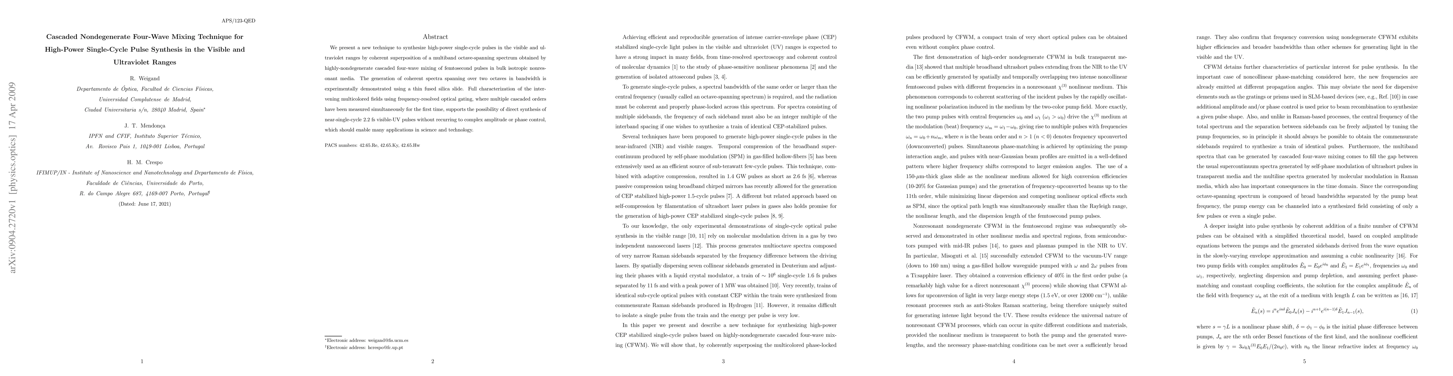 This paper introduces a novel method for generating high-power single-cycle pulses in the visible and ultraviolet ranges via nondegenerate cascaded four-wave mixing in nonresonant media. The technique produces a multiband octave-spanning spectrum, enabling the direct synthesis of near-single-cycle pulses without complex control, with potential applications in science and technology.