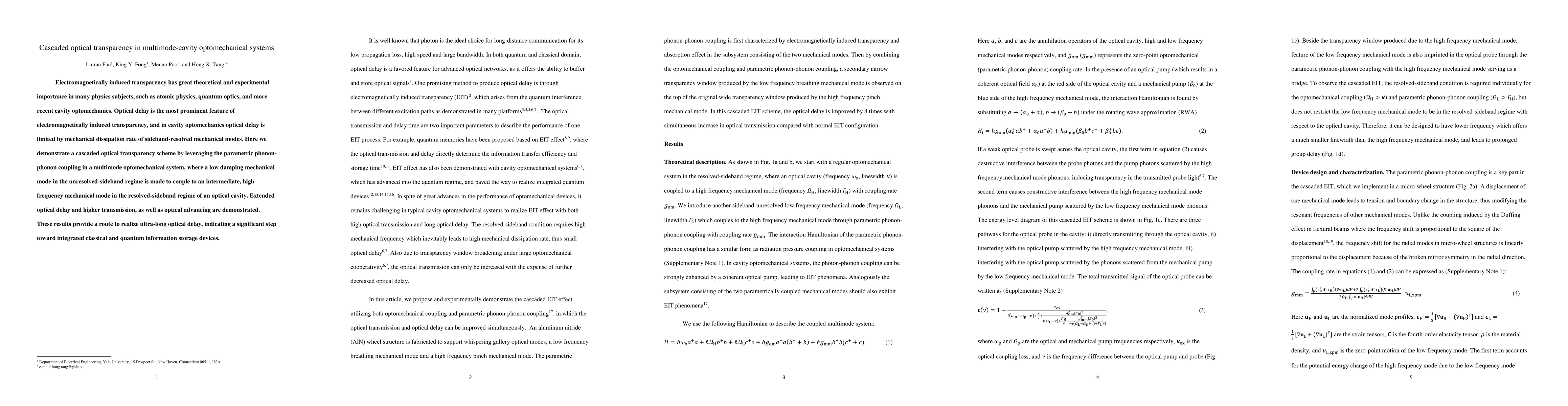 This paper demonstrates a cascaded optical transparency scheme in multimode-cavity optomechanical systems, leveraging parametric phonon-phonon coupling to extend optical delay and achieve higher transmission. This approach shows promise for ultra-long optical delay, advancing the potential for integrated classical and quantum information storage.