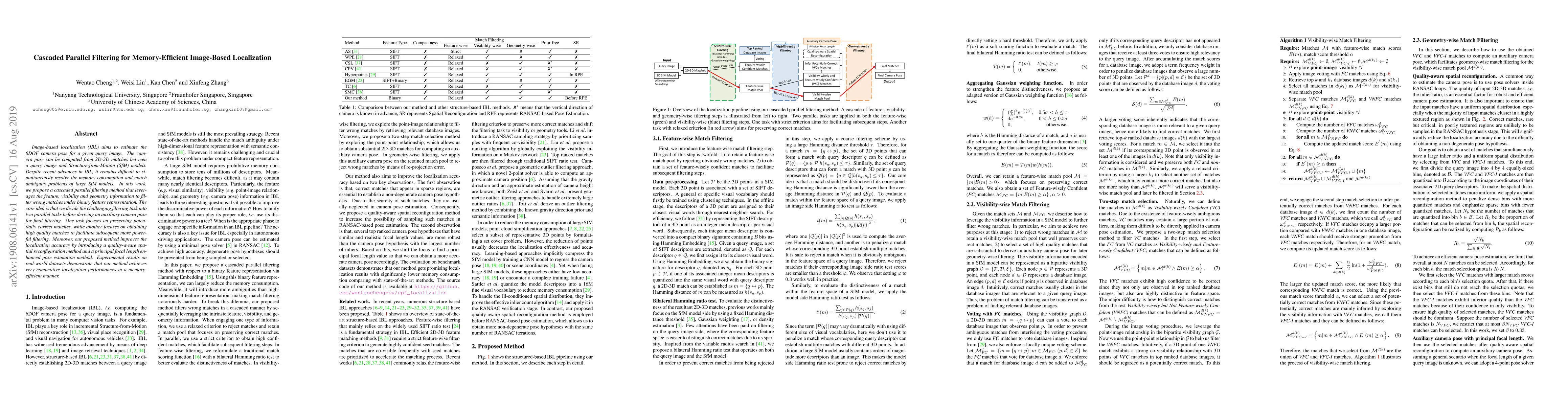 This paper proposes a cascaded parallel filtering method for memory-efficient image-based localization, addressing memory consumption and match ambiguity in large Structure-from-Motion models. The method divides filtering into two parallel tasks, improves localization accuracy, and demonstrates competitive performance on real-world datasets.