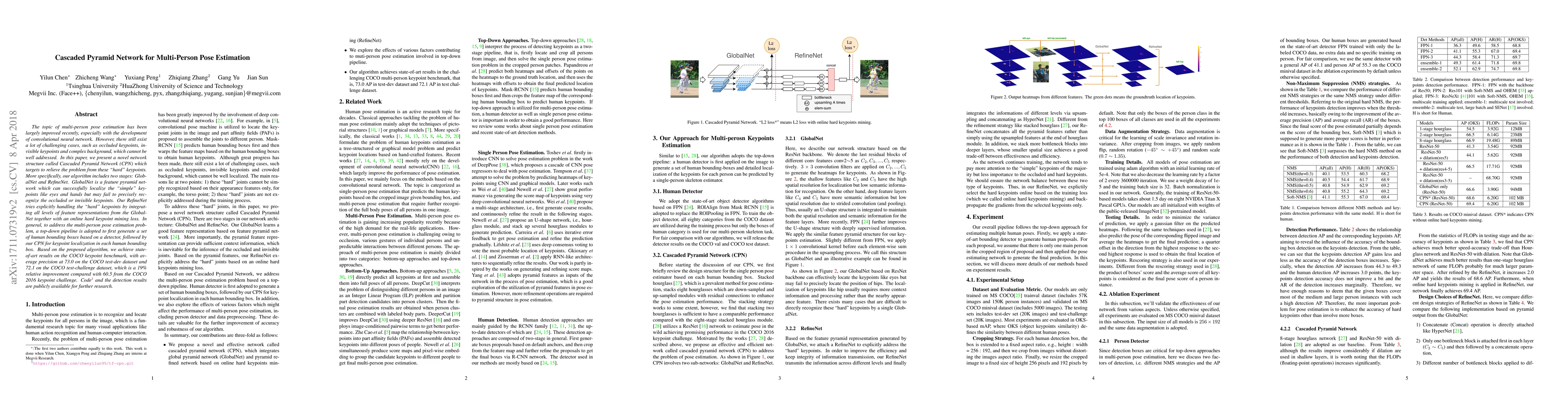 This paper presents a Cascaded Pyramid Network (CPN) for multi-person pose estimation, addressing challenges like occluded and invisible keypoints. The CPN includes GlobalNet for localizing simple keypoints and RefineNet for handling hard keypoints through an integrated feature pyramid and hard keypoint mining loss, achieving a 19% relative improvement over previous methods on the COCO benchmark.
