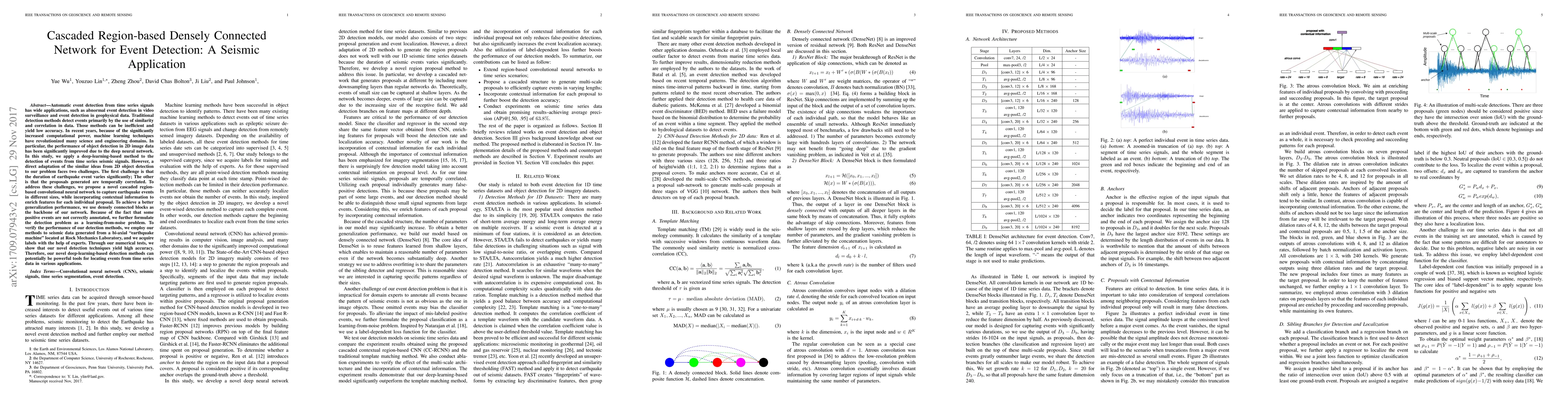 This paper proposes a novel cascaded region-based densely connected convolutional neural network for detecting events in time series seismic signals, addressing challenges of variable event duration and temporally correlated proposals. The method achieves high accuracy in detecting earthquakes, demonstrating potential for various time series event detection applications.