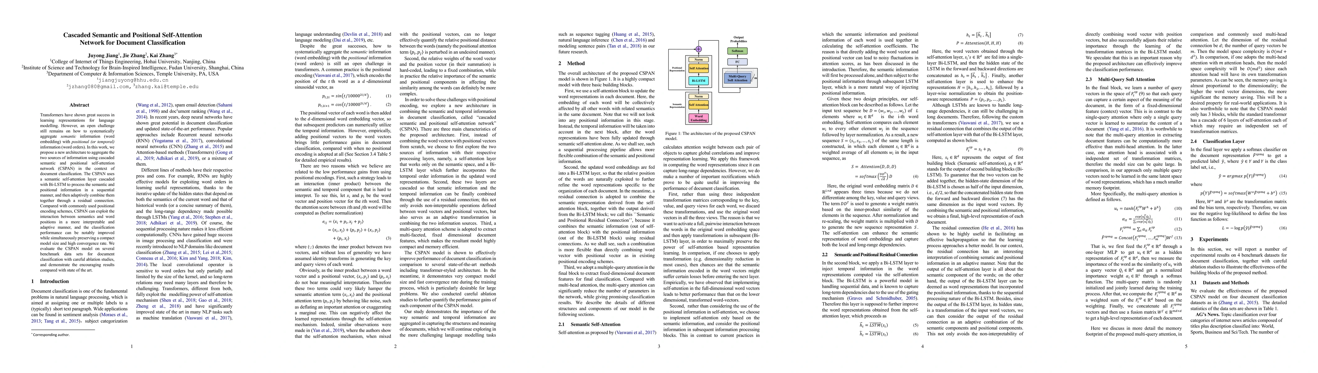 This paper proposes a Cascaded Semantic and Positional Attention Network (CSPAN) to enhance document classification by combining semantic and positional information through a self-attention mechanism and Bi-LSTM. The model achieves better performance than state-of-the-art methods while maintaining a compact size and high convergence rate.