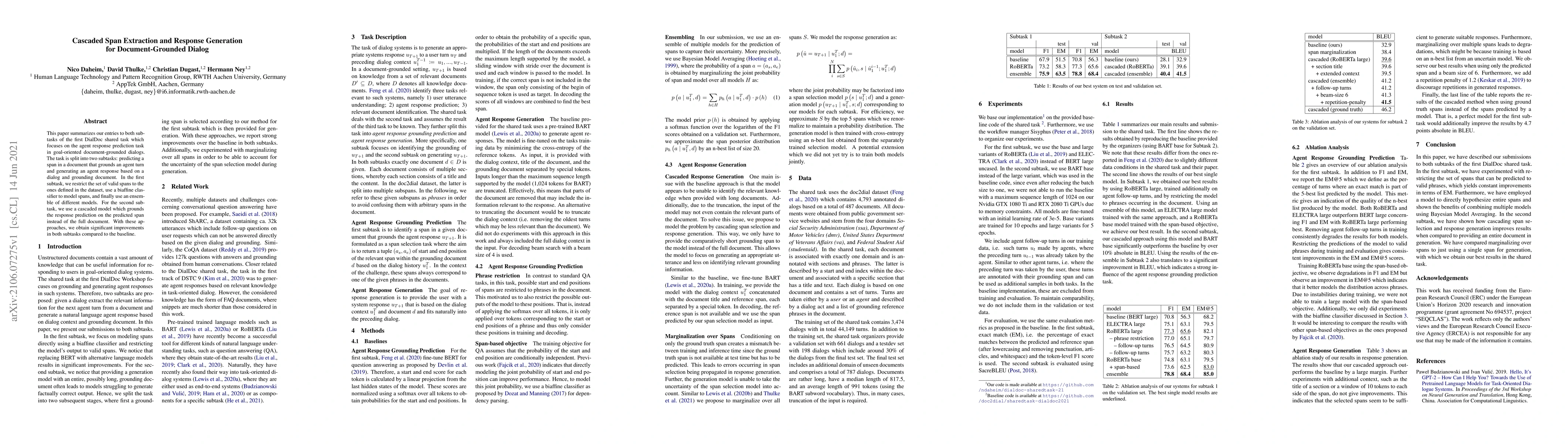 This paper summarizes our entries to both subtasks of the first DialDoc shared task which focuses on the agent response prediction task in goal-oriented document-grounded dialogs. The task is split into two subtasks: predicting a span in a document that grounds an agent turn and generating an agent response based on a dialog and grounding document. In the first subtask, we restrict the set of valid spans to the ones defined in the dataset, use a biaffine classifier to model spans, and finally use an ensemble of different models. For the second subtask, we use a cascaded model which grounds the response prediction on the predicted span instead of the full document. With these approaches, we obtain significant improvements in both subtasks compared to the baseline.