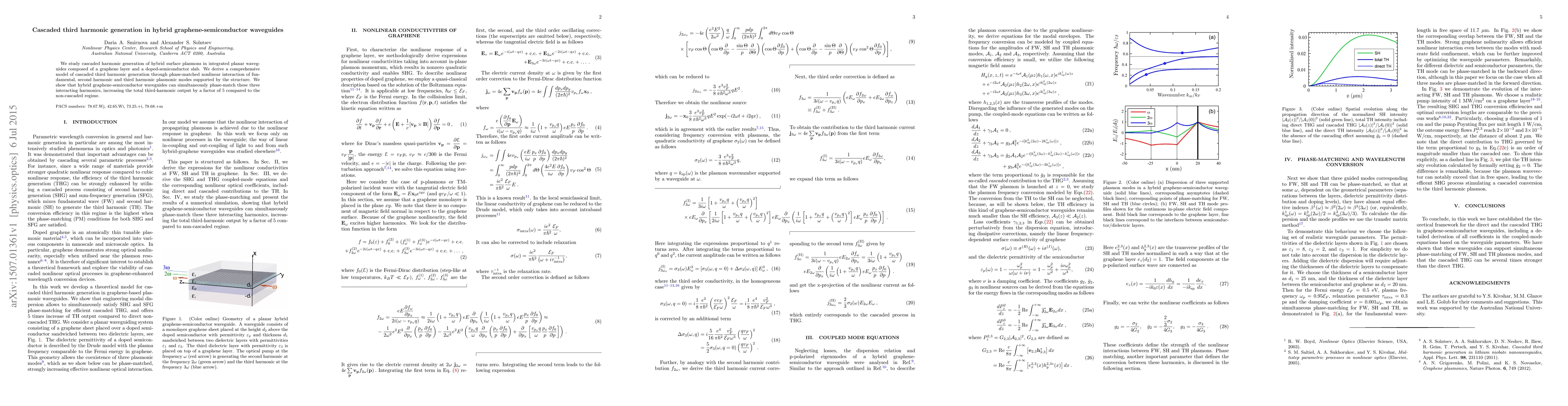 This research investigates cascaded third harmonic generation in integrated planar waveguides combining graphene and doped semiconductors. The study reveals a comprehensive model demonstrating the phase-matched nonlinear interaction of fundamental, second, and third harmonic plasmonic modes, resulting in a five-fold increase in third-harmonic output compared to non-cascaded processes.