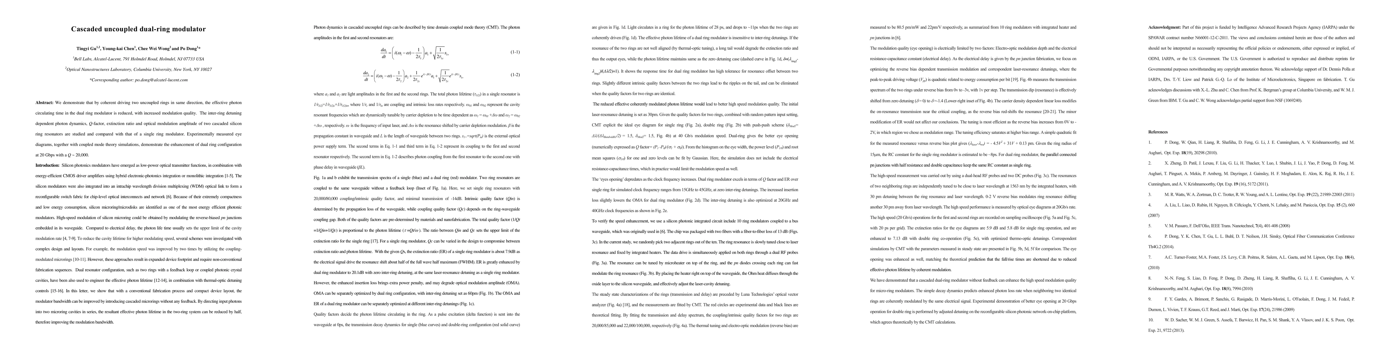 This paper demonstrates the enhanced performance of a cascaded uncoupled dual-ring modulator driven coherently in the same direction, showing improved modulation quality and reduced effective photon circulating time compared to a single ring modulator. Experimental results and simulations show significant improvements in Q-factor, extinction ratio, and modulation amplitude at 20 Gbps.