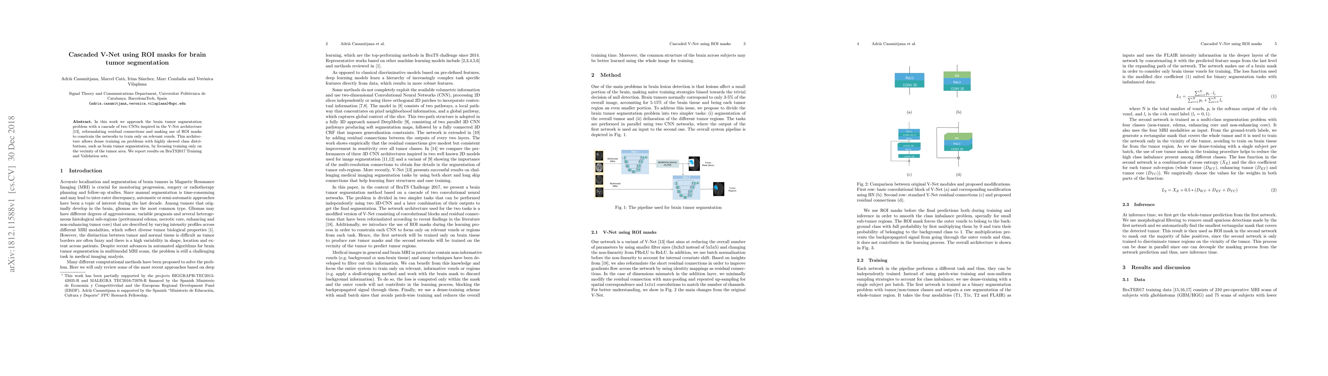 This research introduces a cascaded V-Net architecture for brain tumor segmentation, utilizing ROI masks to focus on tumor areas, enabling efficient training on skewed datasets like BraTS2017. Results are reported for Training and Validation sets.