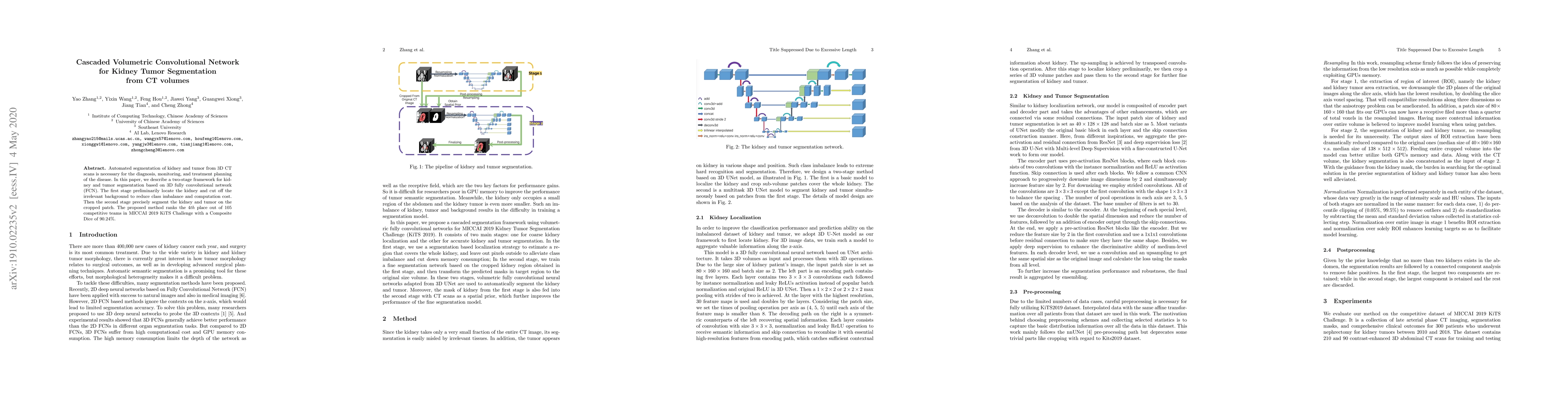 This paper presents a two-stage 3D fully convolutional network for automated kidney and tumor segmentation from CT scans, achieving 4th place in the MICCAI 2019 KiTS Challenge with a Composite Dice score of 90.24%. The method first locates the kidney and reduces background to improve efficiency, followed by precise segmentation of kidney and tumor on cropped patches.