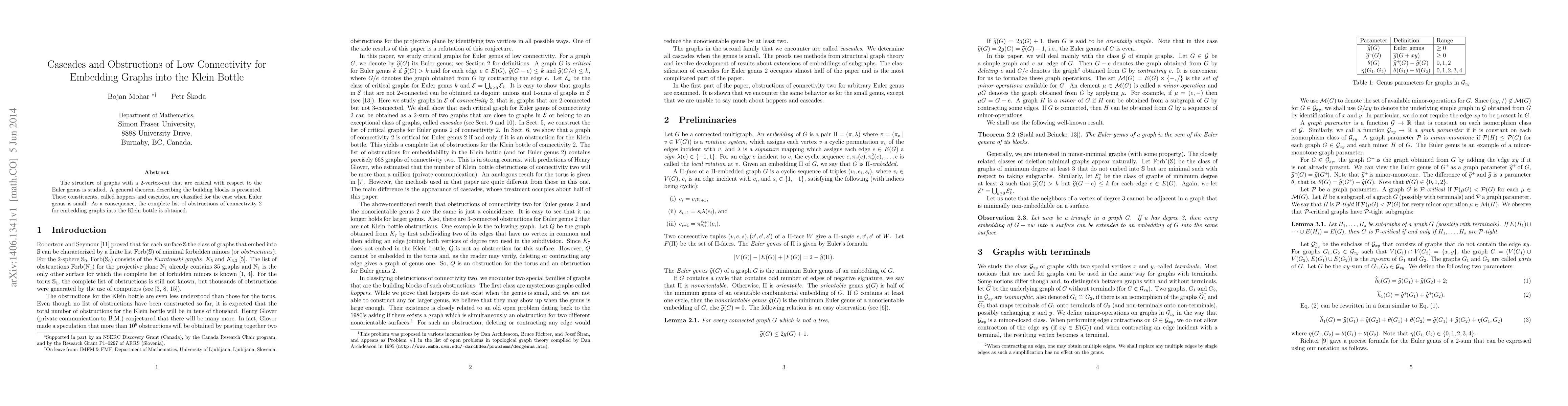 The structure of graphs with a 2-vertex-cut that are critical with respect to the Euler genus is studied. A general theorem describing the building blocks is presented. These constituents, called hoppers and cascades, are classified for the case when Euler genus is small. As a consequence, the complete list of obstructions of connectivity 2 for embedding graphs into the Klein bottle is obtained.