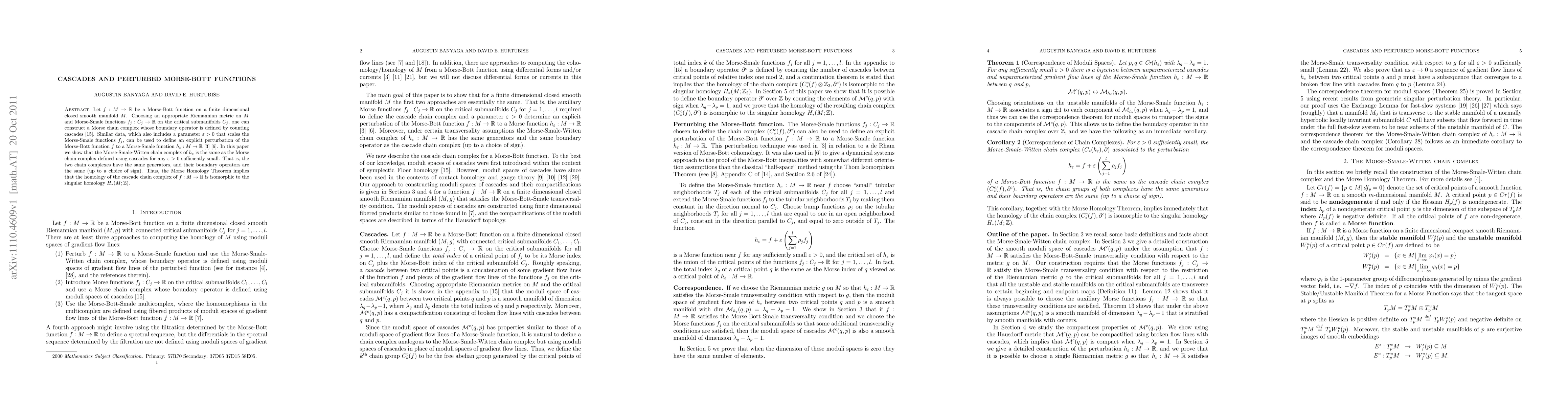 This paper investigates the relationship between perturbed Morse-Bott functions and Morse-Smale functions, showing that the Morse-Smale-Witten chain complex for a perturbed function matches the Morse chain complex defined by cascades for sufficiently small perturbations. It concludes that the homology of the cascade chain complex is isomorphic to the singular homology of the manifold.