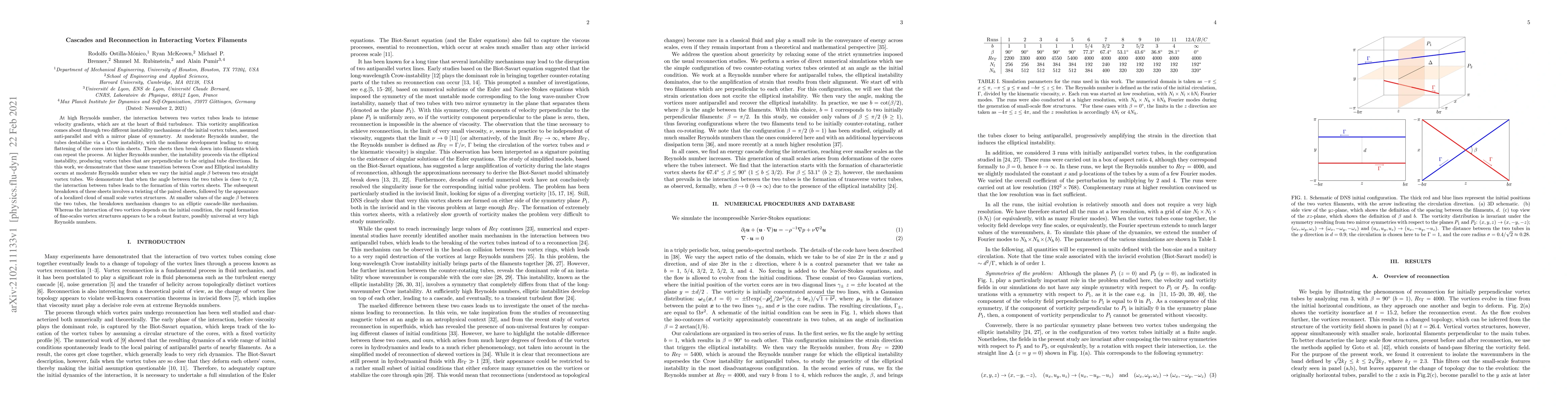 This paper investigates the interaction between two vortex tubes at varying Reynolds numbers, showing that the Crow and Elliptical instabilities lead to different breakdown mechanisms. At moderate Reynolds numbers, the tubes destabilize via Crow instability, forming thin vortex sheets that break into filaments, while at higher Reynolds numbers, the elliptical instability creates perpendicular vortex tubes. The study reveals that the angle between the vortex tubes significantly influences the breakdown process, with near-perpendicular interactions leading to localized vortex clouds, while smaller angles trigger an elliptic cascade.