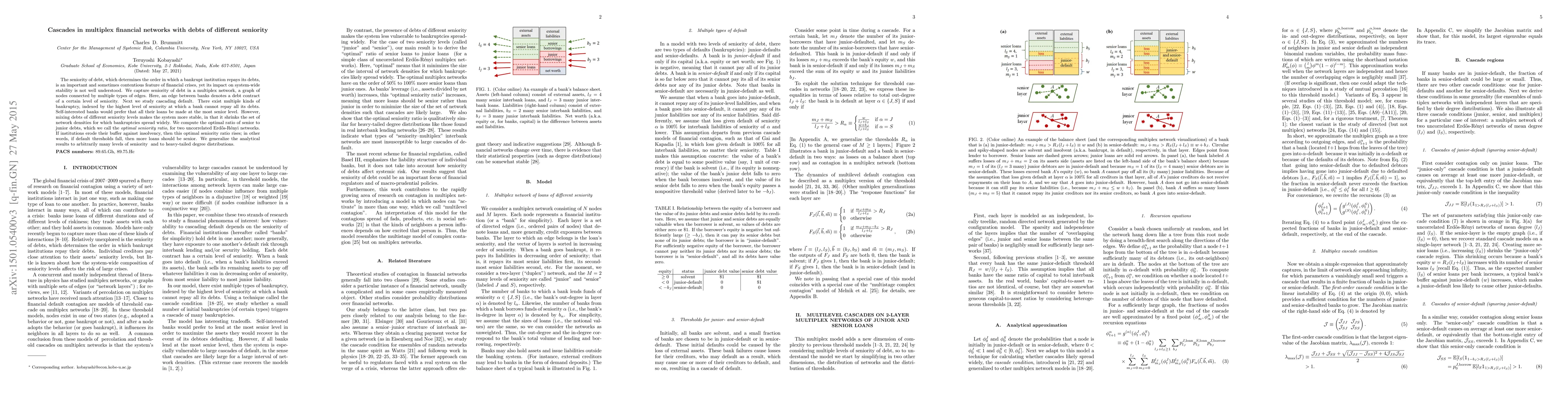 The seniority of debt, which determines the order in which a bankrupt institution repays its debts, is an important and sometimes contentious feature of financial crises, yet its impact on system-wide stability is not well understood. We capture seniority of debt in a multiplex network, a graph of nodes connected by multiple types of edges. Here, an edge between banks denotes a debt contract of a certain level of seniority. Next we study cascading default. There exist multiple kinds of bankruptcy, indexed by the highest level of seniority at which a bank cannot repay all its debts. Self-interested banks would prefer that all their loans be made at the most senior level. However, mixing debts of different seniority levels makes the system more stable, in that it shrinks the set of network densities for which bankruptcies spread widely. We compute the optimal ratio of senior to junior debts, which we call the optimal seniority ratio, for two uncorrelated Erdos-Renyi networks. If institutions erode their buffer against insolvency, then this optimal seniority ratio rises; in other words, if default thresholds fall, then more loans should be senior. We generalize the analytical results to arbitrarily many levels of seniority and to heavy-tailed degree distributions.