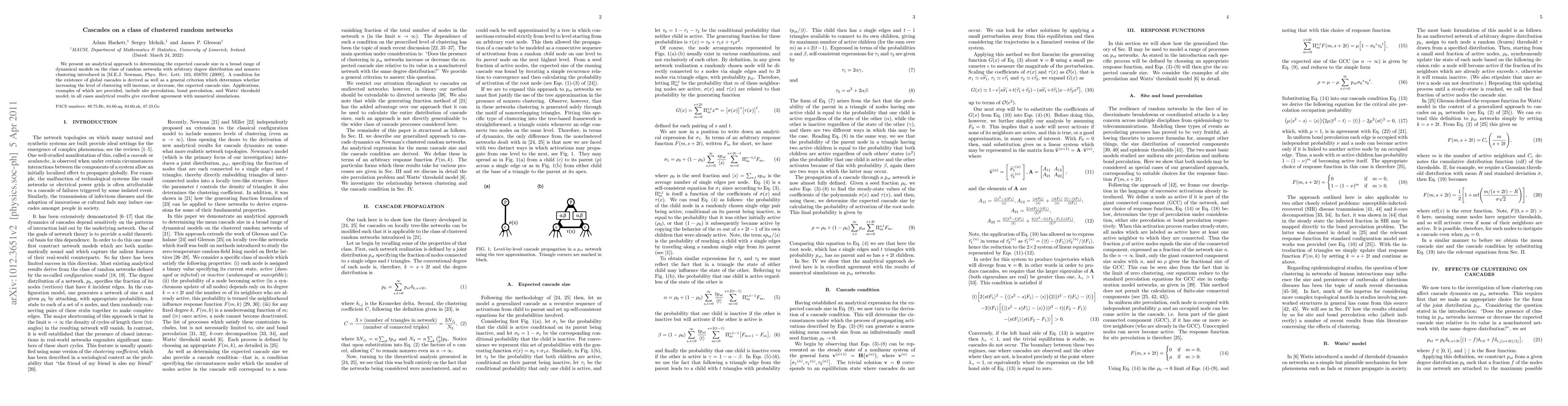 This paper analytically determines the expected cascade size in clustered random networks, deriving conditions for global cascades and criteria for how clustering affects cascade size. Analytical results align well with numerical simulations for models like site and bond percolation, and the Watts' threshold model.