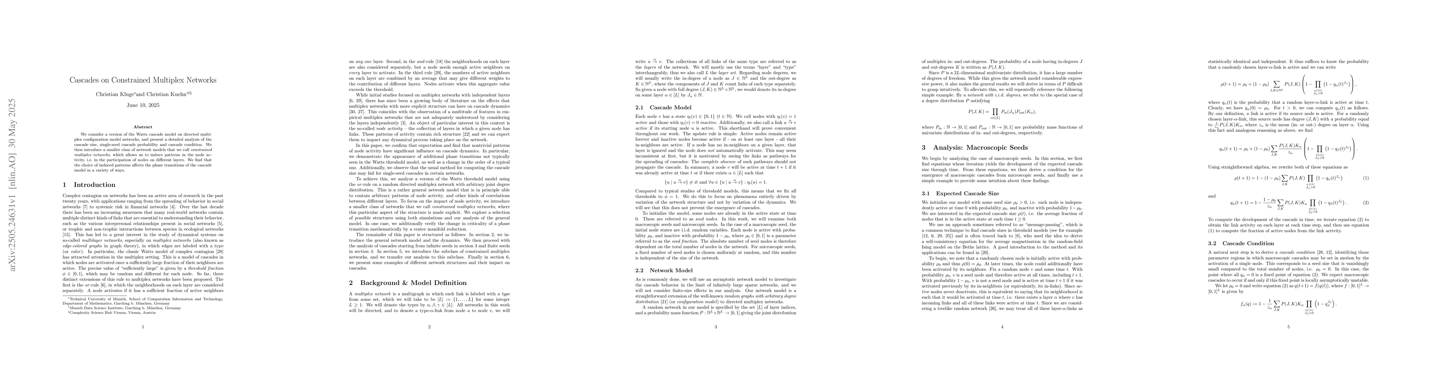 The research employs a detailed analysis of the Watts cascade model on directed multiplex configuration model networks, introducing a class of network models called constrained multiplex networks to induce patterns in node activity across layers.