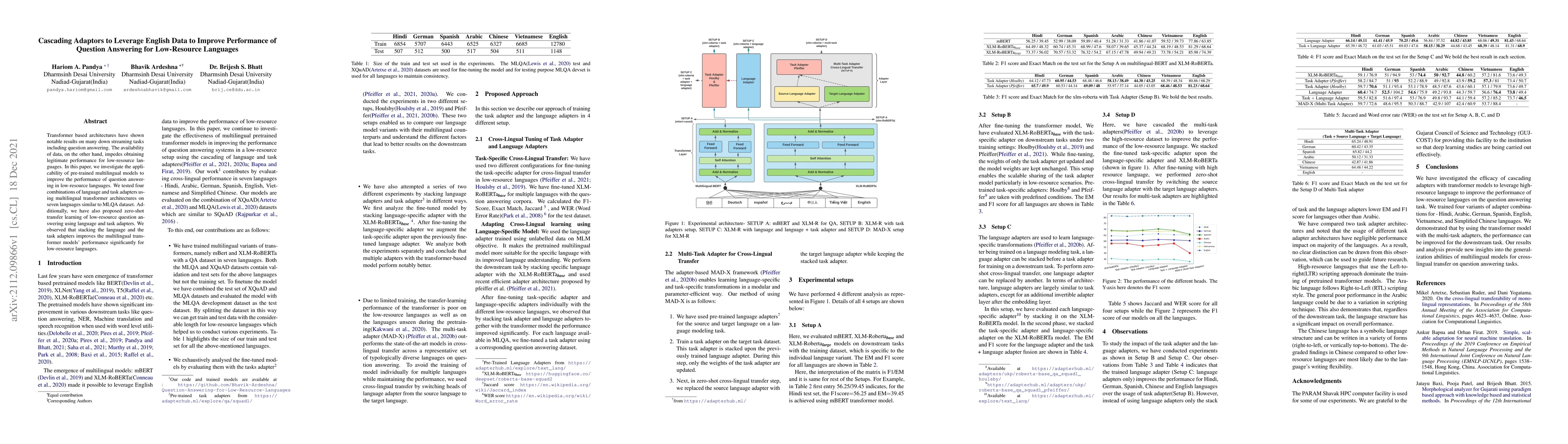 This paper explores using pre-trained multilingual transformer models with cascading language and task adapters to enhance question answering performance in low-resource languages. The study demonstrates significant improvements through zero-shot transfer learning and stacking adapters across seven languages, highlighting the potential of this approach.