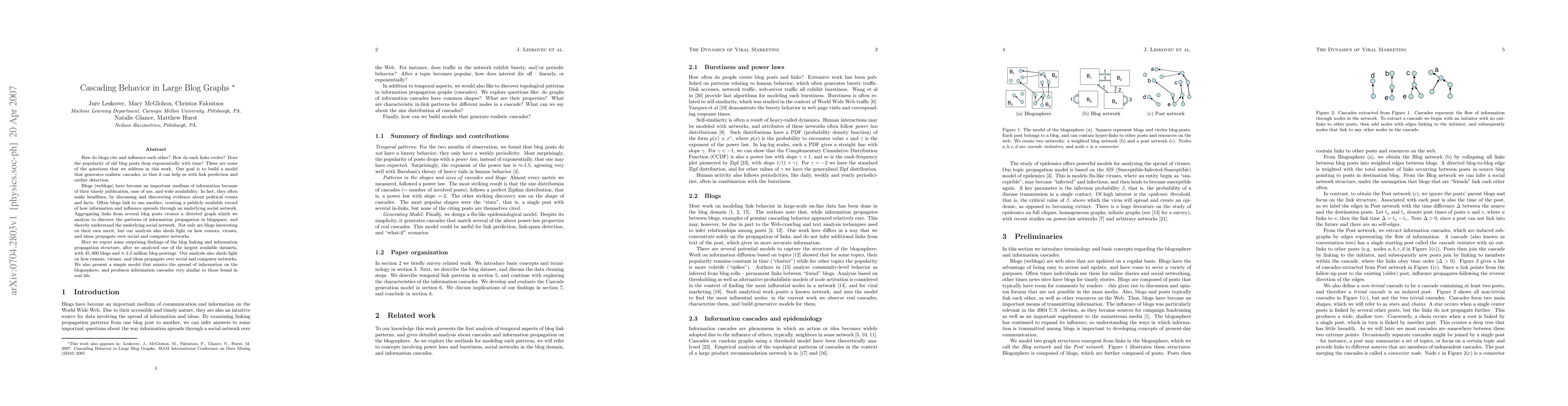 This paper investigates how blogs link and influence each other, analyzing a large dataset of 45,000 blogs and 2.2 million posts to uncover patterns of information propagation. It also develops a model that mimics real-life information cascades, aiding link prediction and outlier detection.