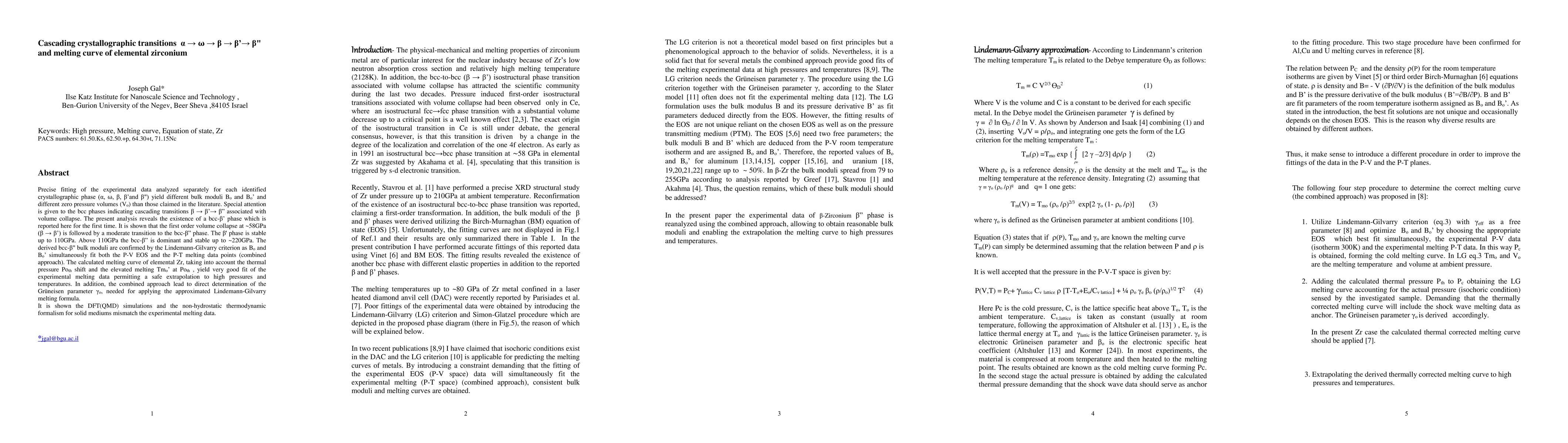 Precise fitting of the experimental data analyzed separately for each identified crystallographic phase alpha, omega, beta, beta prime and beta double prime yield different bulk moduli Bo and Bo prime and different zero pressure volumes (Vo) than those claimed in the literature. Special attention is given to the bcc phases indicating cascading transitions beta to beta prime to beta double prime associated with volume collapse. The present analysis reveals the existence of a bcc-beta prime phase which is reported here for the first time. It is shown that the first order volume collapse at about 58GPa beta to beta prime is followed by a moderate transition to the bcc-beta double prime phase. The beta prime phase is stable up to 110GPa. Above 110GPa the bcc-beta double prime is dominant and stable up to about 220GPa. The derived bcc-double prime bulk moduli are confirmed by the Lindemann-Gilvarry criterion as Bo and Bo prime simultaneously fit both the P-V EOS and the P-T melting data points (combined approach). The calculated melting curve of elemental Zr, taking into account the thermal pressure Poth shift and the elevated melting Tmo prime at Poth , yield very good fit of the experimental melting data permitting a safe extrapolation to high pressures and temperatures. In addition, the combined approach lead to direct determination of the Greuneisen parameter gammao, needed for applying the approximated Lindemann-Gilvarry melting formula.