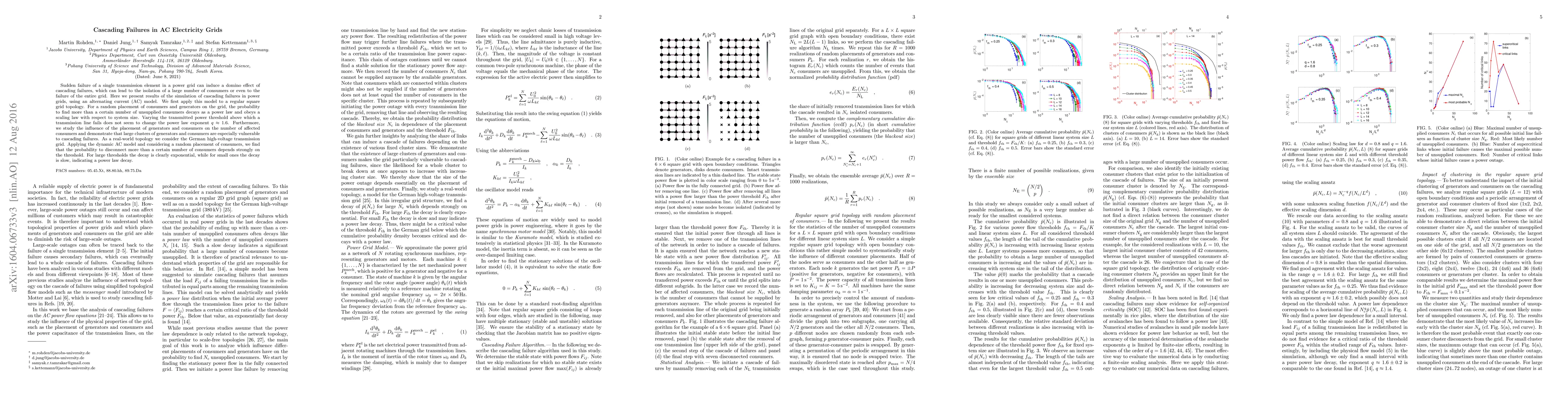 This paper investigates cascading failures in AC electricity grids using a simulation model, finding that the probability of unsupplied consumers follows a power law. It highlights the vulnerability of large clusters of generators and consumers, and shows different decay patterns in the German high-voltage grid depending on the failure threshold.