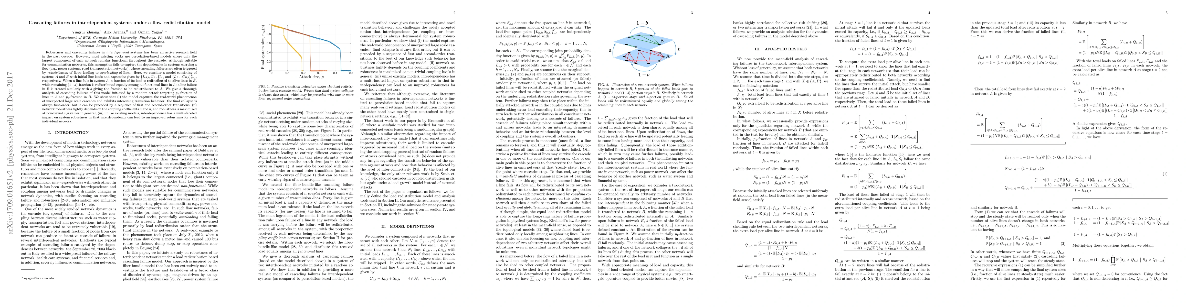 This research paper proposes a new model for cascading failures in interdependent systems with flow redistribution, showing that robustness depends on coupling coefficients and individual network improvements.