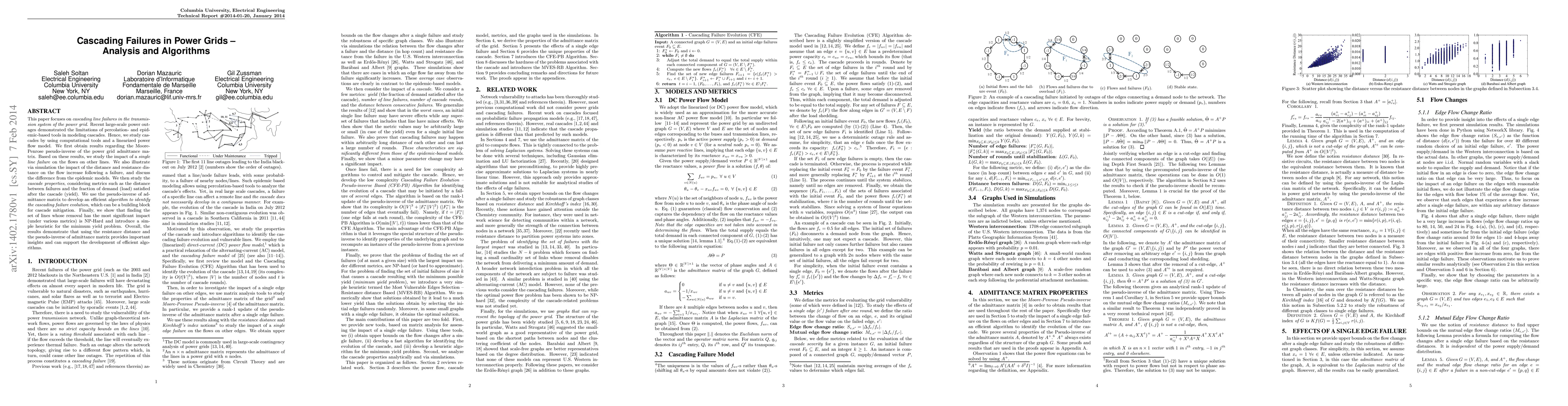 This paper focuses on cascading line failures in the transmission system of the power grid. Recent large-scale power outages demonstrated the limitations of percolation- and epid- emic-based tools in modeling cascades. Hence, we study cascades by using computational tools and a linearized power flow model. We first obtain results regarding the Moore-Penrose pseudo-inverse of the power grid admittance matrix. Based on these results, we study the impact of a single line failure on the flows on other lines. We also illustrate via simulation the impact of the distance and resistance distance on the flow increase following a failure, and discuss the difference from the epidemic models. We then study the cascade properties, considering metrics such as the distance between failures and the fraction of demand (load) satisfied after the cascade (yield). We use the pseudo-inverse of admittance matrix to develop an efficient algorithm to identify the cascading failure evolution, which can be a building block for cascade mitigation. Finally, we show that finding the set of lines whose removal has the most significant impact (under various metrics) is NP-Hard and introduce a simple heuristic for the minimum yield problem. Overall, the results demonstrate that using the resistance distance and the pseudo-inverse of admittance matrix provides important insights and can support the development of efficient algorithms.