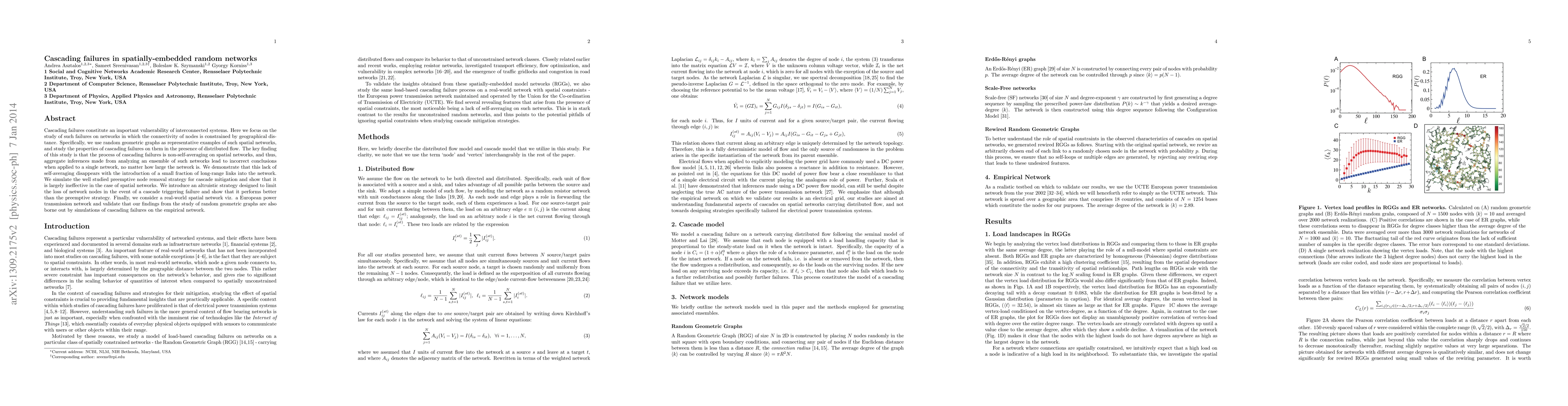 This paper explores cascading failures in spatially-embedded random networks, finding that such failures are non-self-averaging and that preemptive mitigation strategies are ineffective. An introduced altruistic strategy is shown to better limit node loss, and results are validated on a European power transmission network.