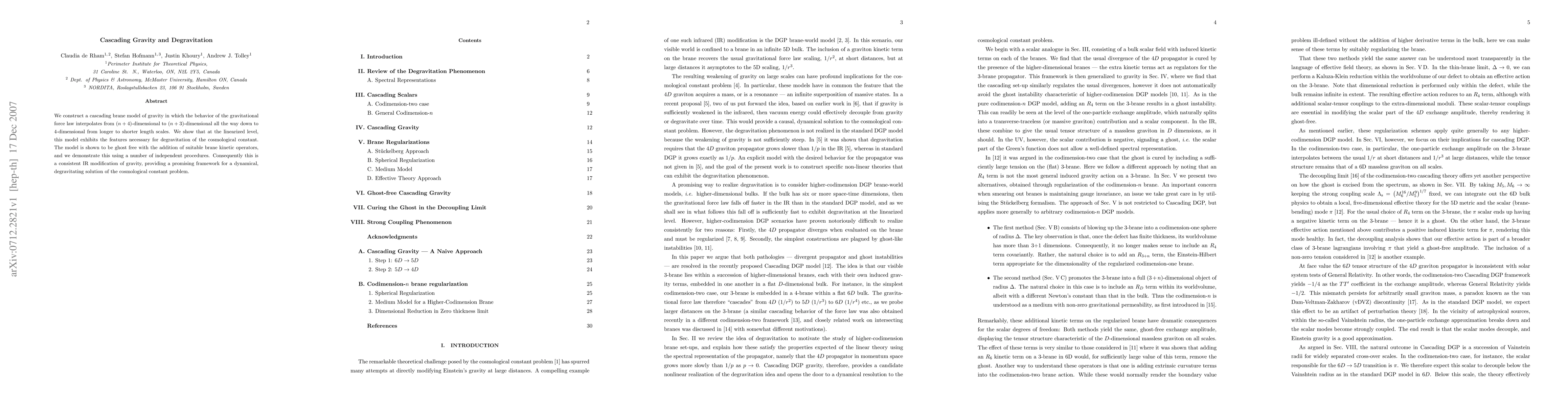 We construct a cascading brane model of gravity in which the behavior of the gravitational force law interpolates from (n+4)-dimensional to (n+3)-dimensional all the way down to 4-dimensional from longer to shorter length scales. We show that at the linearized level, this model exhibits the features necessary for degravitation of the cosmological constant. The model is shown to be ghost free with the addition of suitable brane kinetic operators, and we demonstrate this using a number of independent procedures. Consequently this is a consistent IR modification of gravity, providing a promising framework for a dynamical, degravitating solution of the cosmological constant problem.