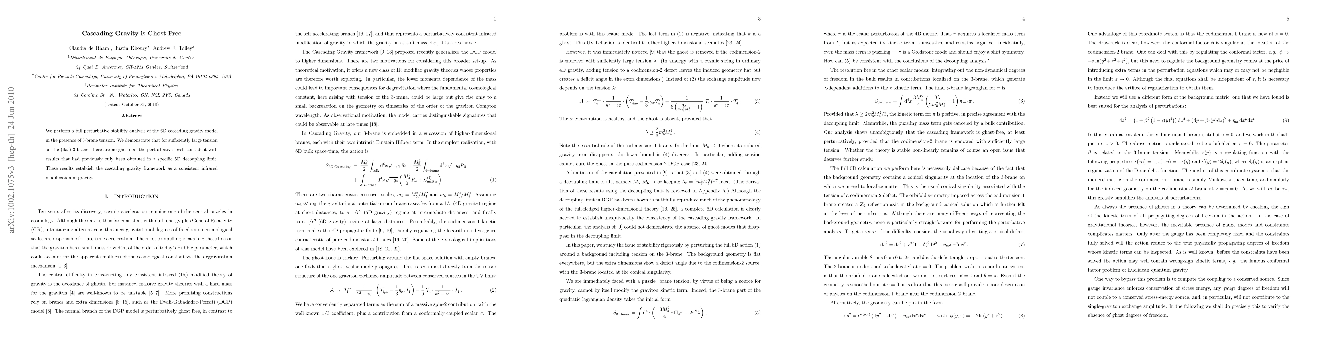 We perform a full perturbative stability analysis of the 6D cascading gravity model in the presence of 3-brane tension. We demonstrate that for sufficiently large tension on the (flat) 3-brane, there are no ghosts at the perturbative level, consistent with results that had previously only been obtained in a specific 5D decoupling limit. These results establish the cascading gravity framework as a consistent infrared modification of gravity.