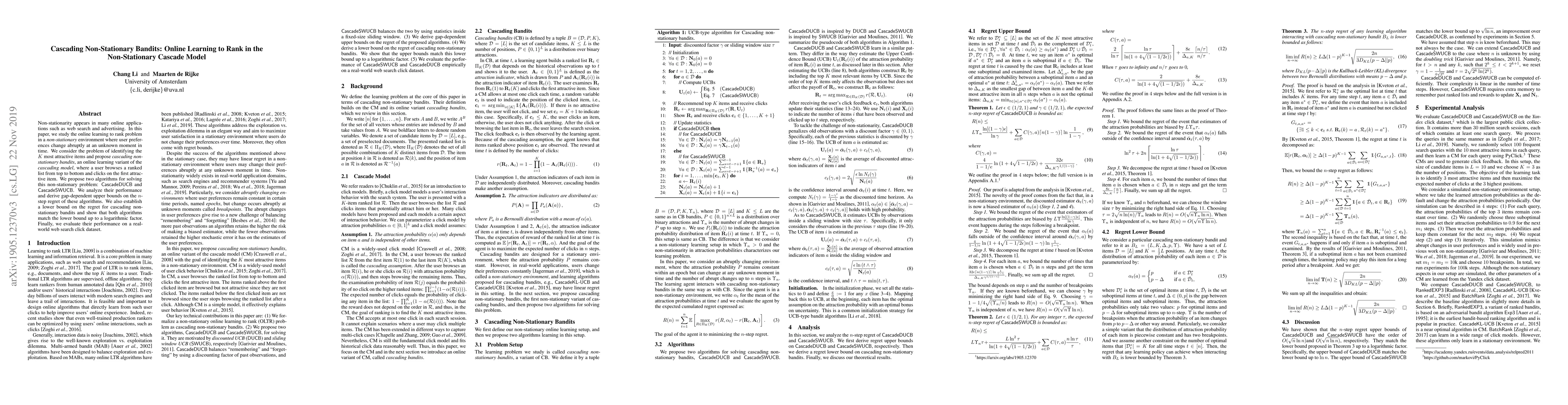 This paper addresses the online learning to rank problem in non-stationary environments, proposing cascading non-stationary bandits to identify the top K attractive items. It introduces two algorithms, CascadeDUCB and CascadeSWUCB, analyzes their performance, and demonstrates their effectiveness through real-world web search data.