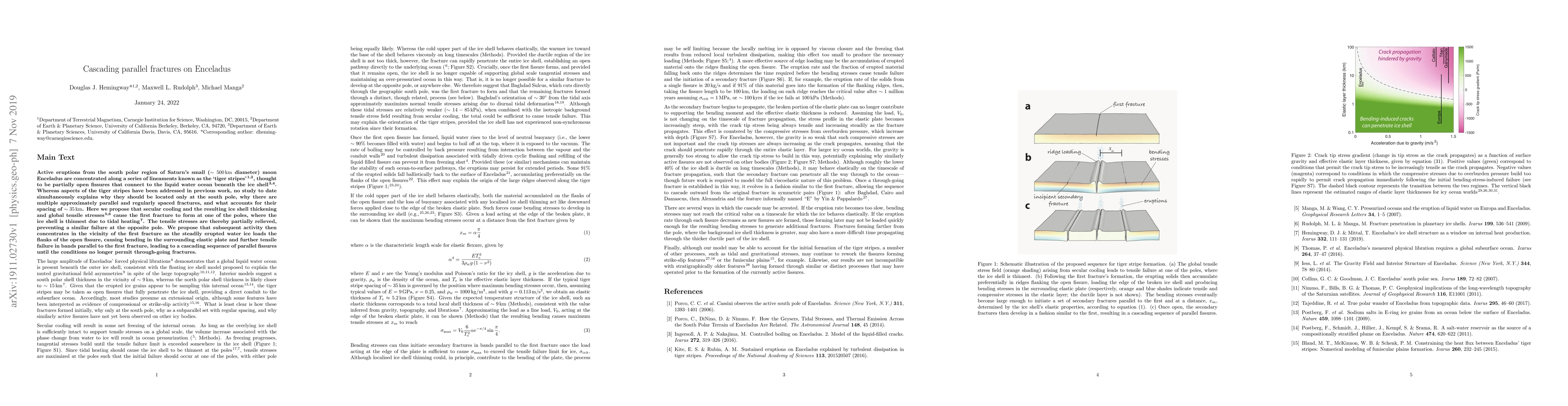Active eruptions from the south polar region of Saturn's small (~500 km diameter) moon Enceladus are concentrated along a series of lineaments known as the `tiger stripes', thought to be partially open fissures that connect to the liquid water ocean beneath the ice shell. Whereas aspects of the tiger stripes have been addressed in previous work, no study to date simultaneously explains why they should be located only at the south pole, why there are multiple approximately parallel and regularly spaced fractures, and what accounts for their spacing of ~35 km. Here we propose that secular cooling and the resulting ice shell thickening and global tensile stresses cause the first fracture to form at one of the poles, where the ice shell is thinnest due to tidal heating. The tensile stresses are thereby partially relieved, preventing a similar failure at the opposite pole. We propose that subsequent activity then concentrates in the vicinity of the first fracture as the steadily erupted water ice loads the flanks of the open fissure, causing bending in the surrounding elastic plate and further tensile failure in bands parallel to the first fracture, leading to a cascading sequence of parallel fissures until the conditions no longer permit through-going fractures.