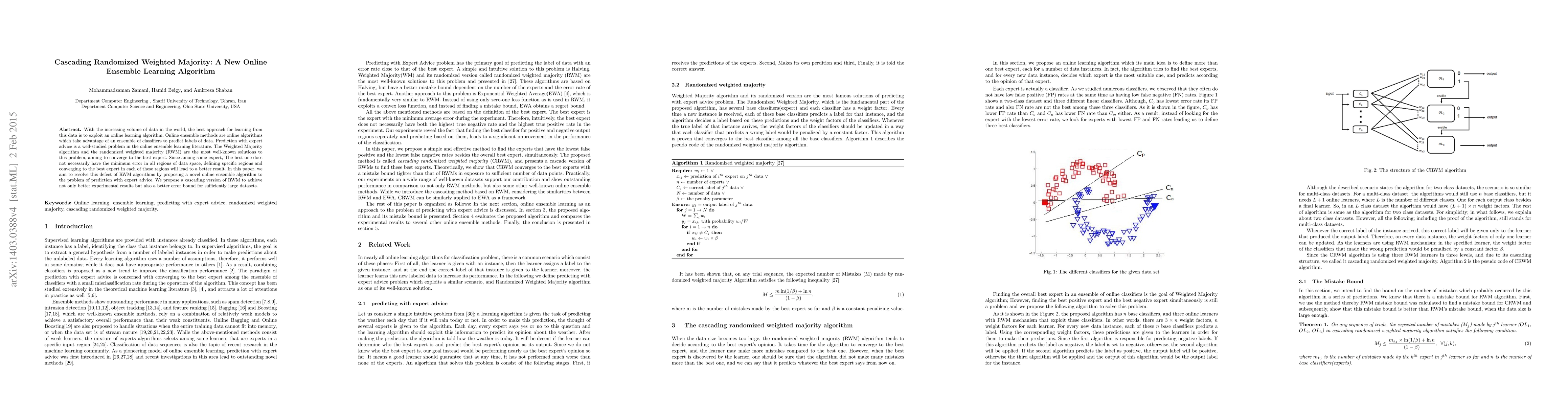 This paper introduces a novel online ensemble algorithm, Cascading Randomized Weighted Majority (CRWM), to address the limitations of existing Randomized Weighted Majority (RWM) algorithms in prediction with expert advice. CRWM aims to improve performance and error bounds for large datasets by defining specific regions and converging to the best expert within each region.
