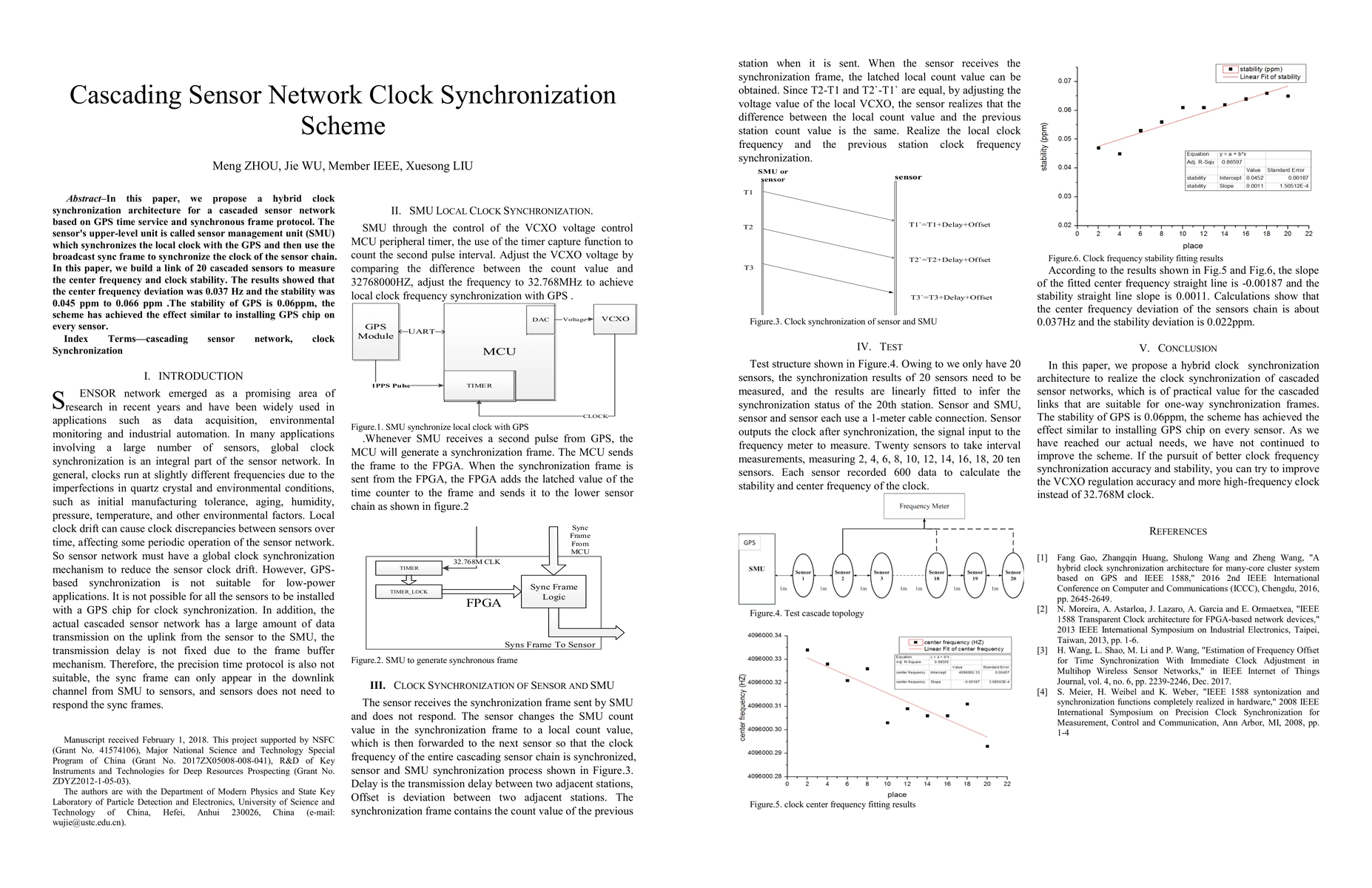 This paper introduces a hybrid clock synchronization scheme for a cascaded sensor network using GPS and a synchronous frame protocol. The proposed architecture employs a sensor management unit (SMU) to synchronize clocks, achieving a center frequency deviation of 0.037 Hz and clock stability between 0.045 ppm and 0.066 ppm, comparable to individual GPS chips on each sensor.