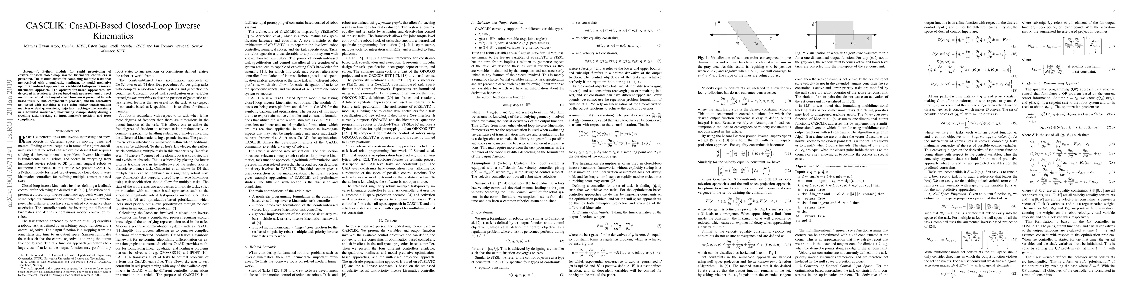 CASCLIK is a Python module for developing closed-loop inverse kinematics controllers using CasADi optimization techniques. It integrates multiple task resolutions through quadratic, nonlinear, or model predictive optimization, and introduces a novel "in tangent cone" function for set-based tasks. The module is tested for various applications including pose matching, trajectory tracking, manipulability maximization, and force compliance.