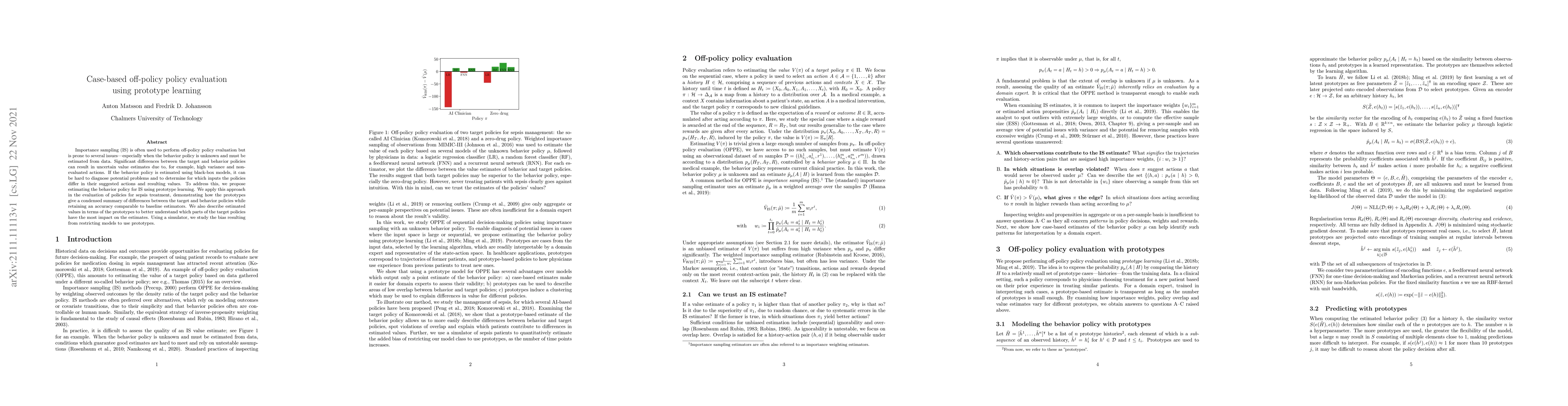 This paper proposes using prototype learning to estimate the behavior policy in importance sampling for off-policy policy evaluation, addressing issues like high variance and non-evaluated actions. The method is demonstrated in sepsis treatment policy evaluation, showing accurate value estimates and providing insights into policy differences through prototypes.