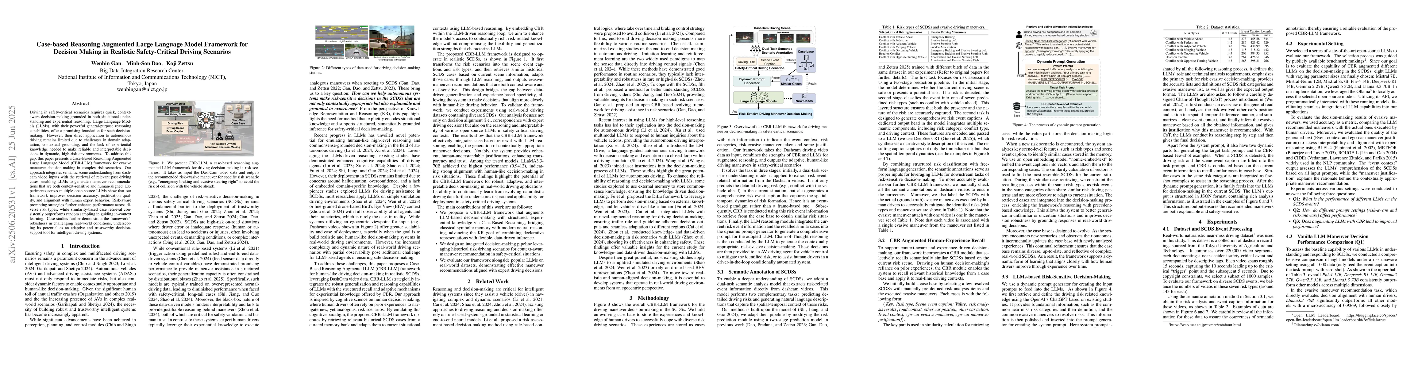 Driving in safety-critical scenarios requires quick, context-aware decision-making grounded in both situational understanding and experiential reasoning. Large Language Models (LLMs), with their powerful general-purpose reasoning capabilities, offer a promising foundation for such decision-making. However, their direct application to autonomous driving remains limited due to challenges in domain adaptation, contextual grounding, and the lack of experiential knowledge needed to make reliable and interpretable decisions in dynamic, high-risk environments. To address this gap, this paper presents a Case-Based Reasoning Augmented Large Language Model (CBR-LLM) framework for evasive maneuver decision-making in complex risk scenarios. Our approach integrates semantic scene understanding from dashcam video inputs with the retrieval of relevant past driving cases, enabling LLMs to generate maneuver recommendations that are both context-sensitive and human-aligned. Experiments across multiple open-source LLMs show that our framework improves decision accuracy, justification quality, and alignment with human expert behavior. Risk-aware prompting strategies further enhance performance across diverse risk types, while similarity-based case retrieval consistently outperforms random sampling in guiding in-context learning. Case studies further demonstrate the framework's robustness in challenging real-world conditions, underscoring its potential as an adaptive and trustworthy decision-support tool for intelligent driving systems.