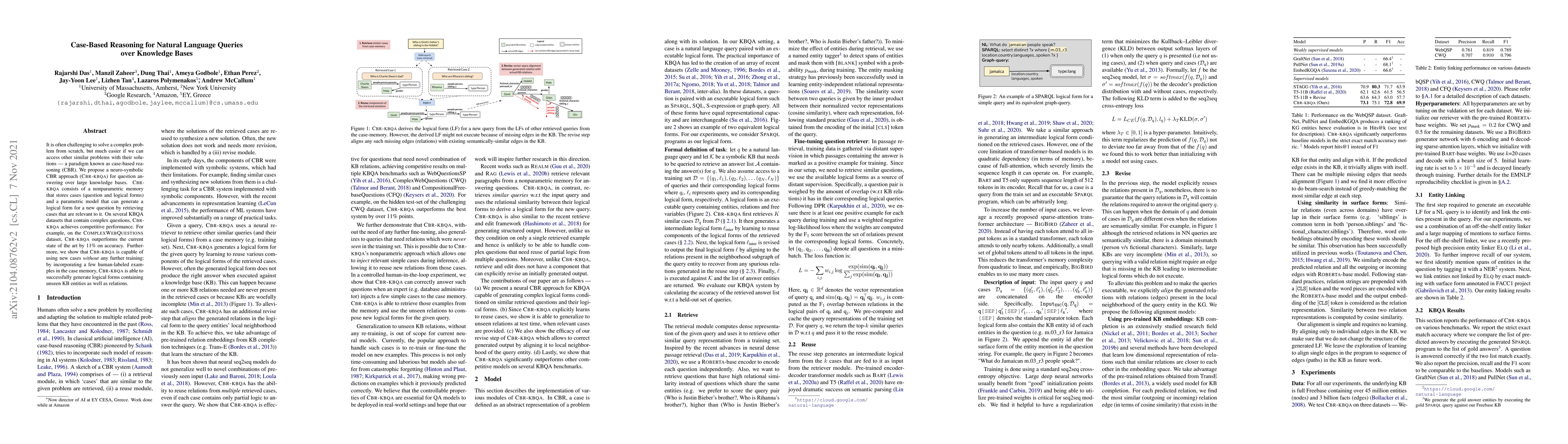 This paper proposes a neuro-symbolic case-based reasoning approach (CBR-KBQA) for answering natural language queries over knowledge bases, achieving competitive performance and outperforming current state-of-the-art methods on complex datasets. CBR-KBQA can generate logical forms for new questions by retrieving relevant cases, and it can incorporate new cases without further training.