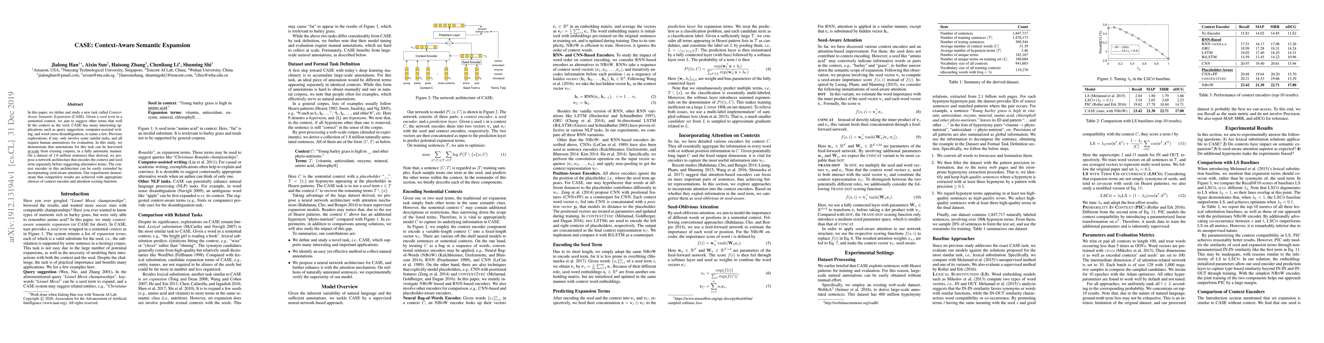 In this paper, we define and study a new task called Context-Aware Semantic Expansion (CASE). Given a seed term in a sentential context, we aim to suggest other terms that well fit the context as the seed. CASE has many interesting applications such as query suggestion, computer-assisted writing, and word sense disambiguation, to name a few. Previous explorations, if any, only involve some similar tasks, and all require human annotations for evaluation. In this study, we demonstrate that annotations for this task can be harvested at scale from existing corpora, in a fully automatic manner. On a dataset of 1.8 million sentences thus derived, we propose a network architecture that encodes the context and seed term separately before suggesting alternative terms. The context encoder in this architecture can be easily extended by incorporating seed-aware attention. Our experiments demonstrate that competitive results are achieved with appropriate choices of context encoder and attention scoring function.
