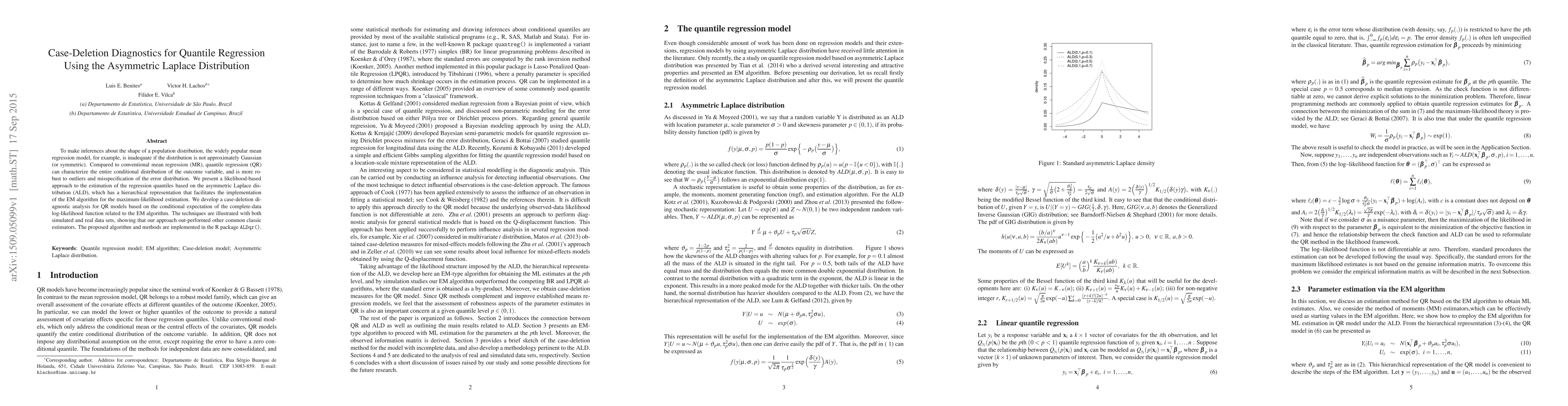 To make inferences about the shape of a population distribution, the widely popular mean regression model, for example, is inadequate if the distribution is not approximately Gaussian (or symmetric). Compared to conventional mean regression (MR), quantile regression (QR) can characterize the entire conditional distribution of the outcome variable, and is more robust to outliers and misspecification of the error distribution. We present a likelihood-based approach to the estimation of the regression quantiles based on the asymmetric Laplace distribution (ALD), which has a hierarchical representation that facilitates the implementation of the EM algorithm for the maximum-likelihood estimation. We develop a case-deletion diagnostic analysis for QR models based on the conditional expectation of the complete-data log-likelihood function related to the EM algorithm. The techniques are illustrated with both simulated and real data sets, showing that our approach out-performed other common classic estimators. The proposed algorithm and methods are implemented in the R package ALDqr().