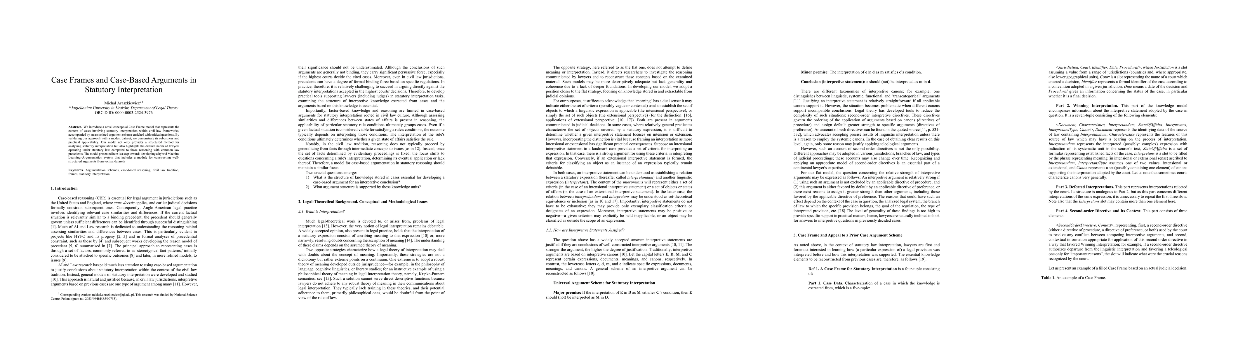 We introduce a novel conceptual Case Frame model that represents the content of cases involving statutory interpretation within civil law frameworks, accompanied by an associated argument scheme enriched with critical questions. By validating our approach with a modest dataset, we demonstrate its robustness and practical applicability. Our model not only provides a structured method for analyzing statutory interpretation but also highlights the distinct needs of lawyers operating under statutory law compared to those reasoning with common law precedents. The model presented here is a step towards developing a hybrid Machine Learning and Argumentation system that includes a module for constructing well-structured arguments from textual datasets.