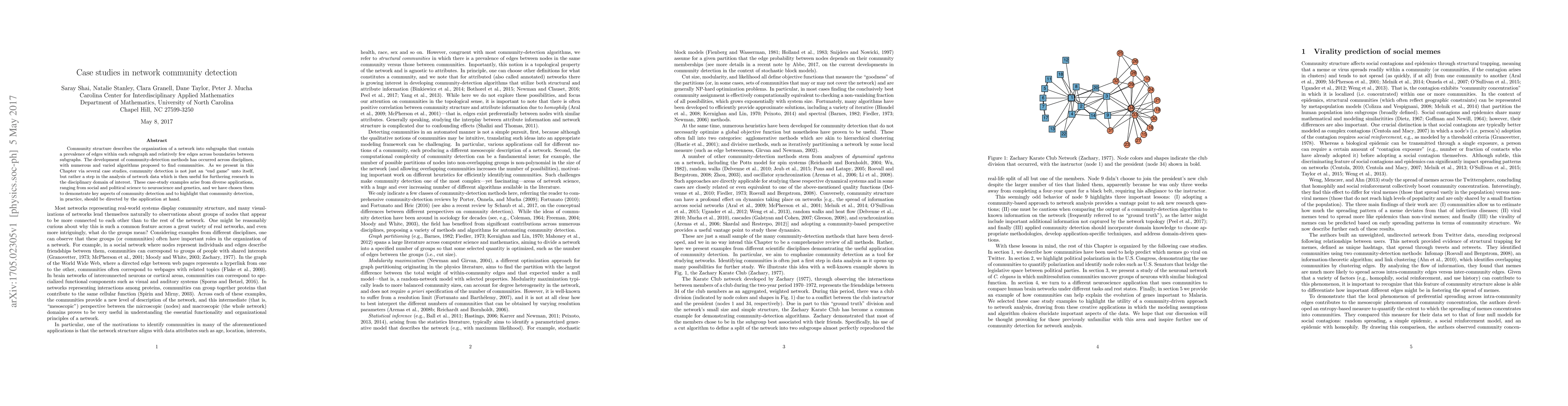 Community structure describes the organization of a network into subgraphs that contain a prevalence of edges within each subgraph and relatively few edges across boundaries between subgraphs. The development of community-detection methods has occurred across disciplines, with numerous and varied algorithms proposed to find communities. As we present in this Chapter via several case studies, community detection is not just an "end game" unto itself, but rather a step in the analysis of network data which is then useful for furthering research in the disciplinary domain of interest. These case-study examples arise from diverse applications, ranging from social and political science to neuroscience and genetics, and we have chosen them to demonstrate key aspects of community detection and to highlight that community detection, in practice, should be directed by the application at hand.