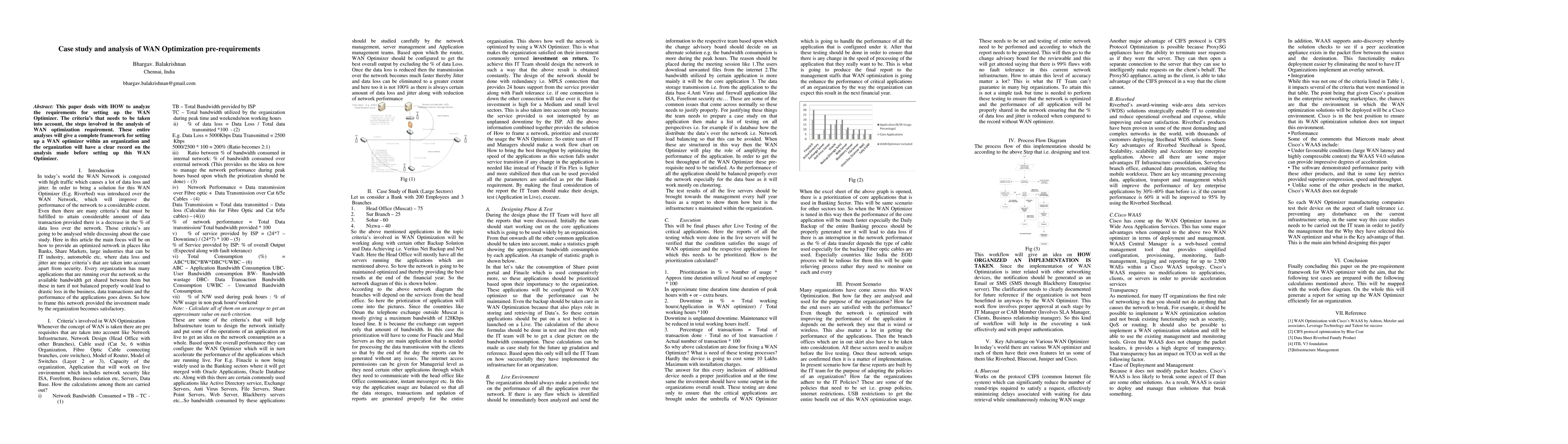 This paper deals with HOW to analyze the requirements for setting up the WAN Optimizer. The criteria's that needs to be taken into account, the steps involved in the analysis of WAN optimization requirement. These entire analyses will give a complete framework for setting up a WAN optimizer within an organization and the organization will have a clear record on the analysis made before setting up this WAN Optimizer.
