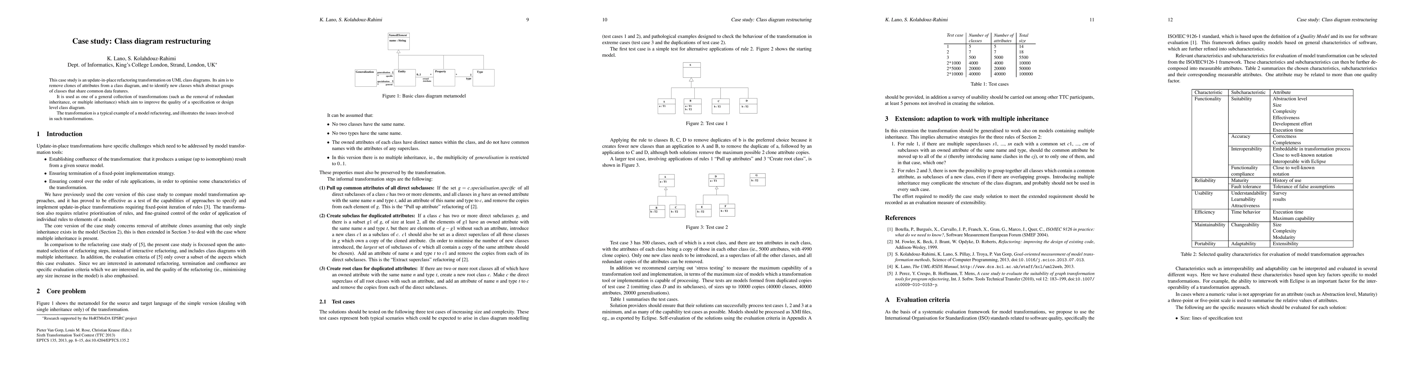 This case study details an in-place refactoring transformation on UML class diagrams to eliminate redundant attribute clones and identify new classes that abstract common data features, thereby improving the overall quality of the design. The transformation exemplifies model refactoring challenges and is part of a broader set of transformations aimed at refining class diagrams.