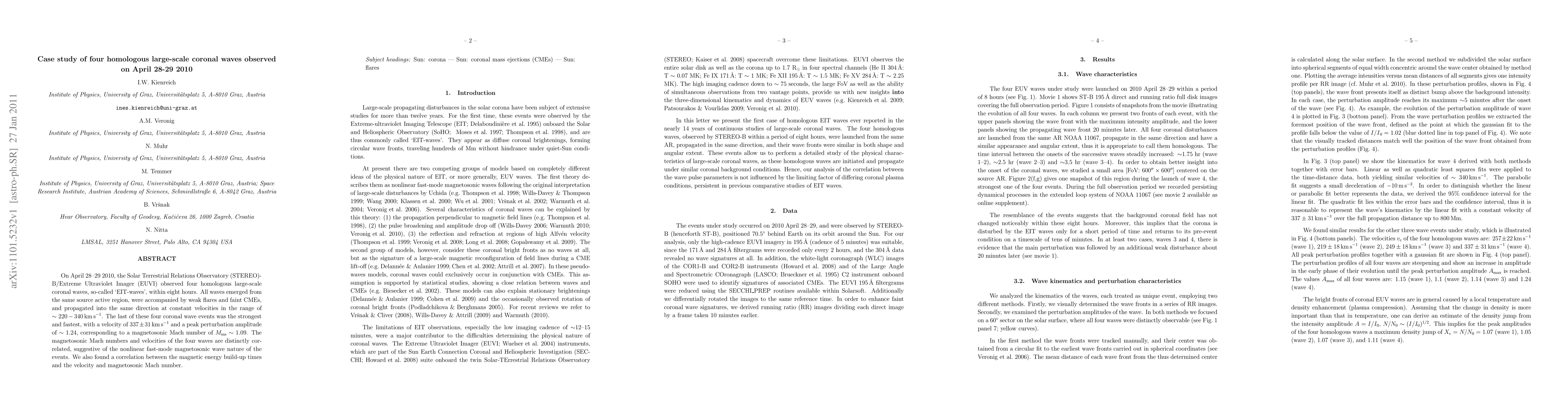Scientists studied four large-scale coronal waves that occurred on April 28-29, 2010, and found they were caused by a single source and traveled at consistent velocities. The findings suggest the events were non-linear waves with strong magnetic connections.