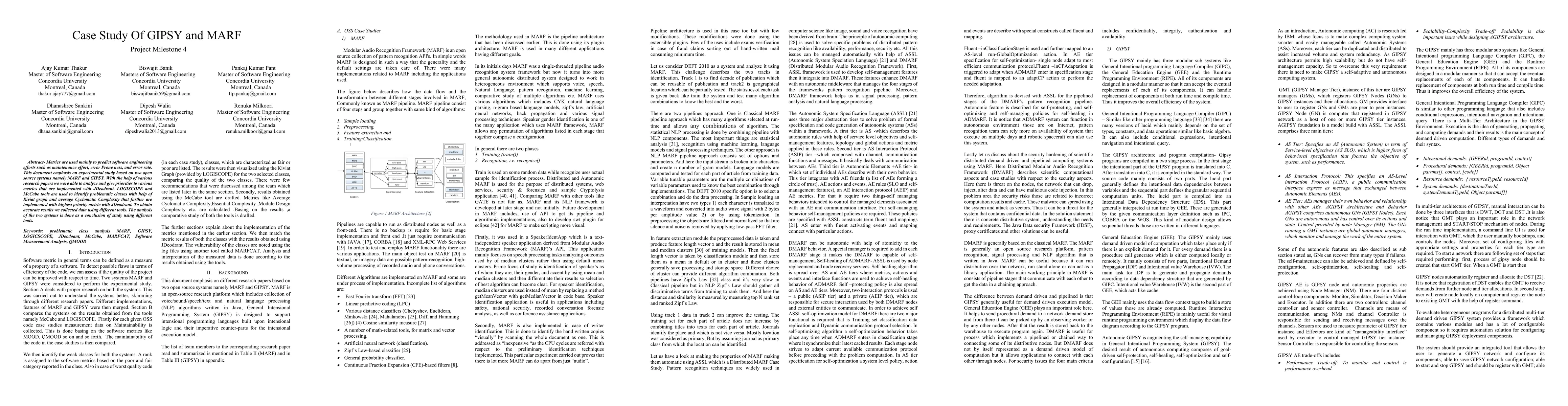 Metrics are used mainly to predict software engineering efforts such as maintenance effort, error Prone ness, and error rate. This document emphasis on experimental study based on two open source systems namely MARF and GIPSY. With the help of various research papers we were able to analyze and give priorities to various metrics that are implemented with JDeodrant. LOGISCOPE and McCabe tools are used to identify problematic classes with help of Kiviat graph and average Cyclomatic Complexity that further are implemented with highest priority metric with JDeodrant. To obtain accurate results we collected data using different tools. The analysis of the two systems is done as a conclusion of study using different tools.